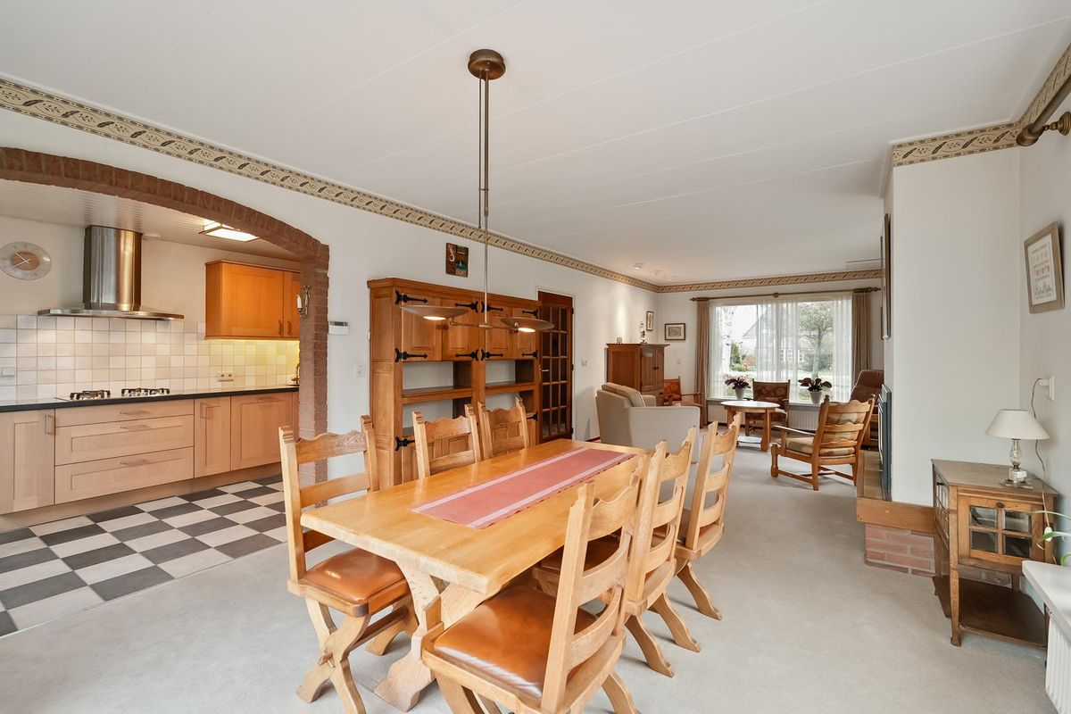 Via de entree aan de voorzijde bereikt u de ruime hal met trapopgang, toiletruimte en toegang tot de overige vertrekken. De royale woonkamer beschikt over een sfeervolle gashaard en een schuifpui naar de prachtig aangelegde achtertuin. De open keuken is uitgevoerd in massief licht eiken en voorzien van diverse inbouwapparatuur, waaronder een koelkast, vaatwasser, gaskookplaat, oven en afzuigkap. Aansluitend vindt u de bijkeuken met aansluiting voor de wasmachine en extra bergruimte. Vanuit hier is de inpandige garage (ca. 21 m²) bereikbaar, evenals de achtertuin.
