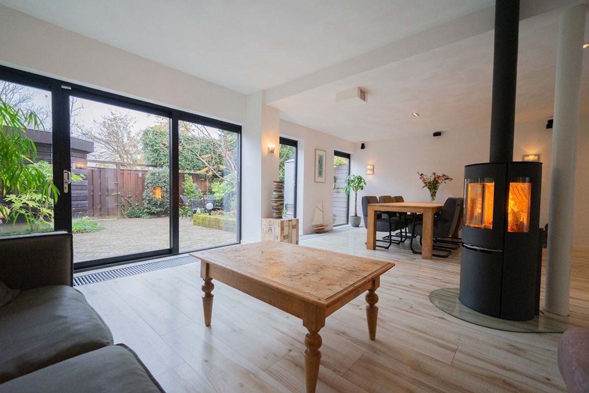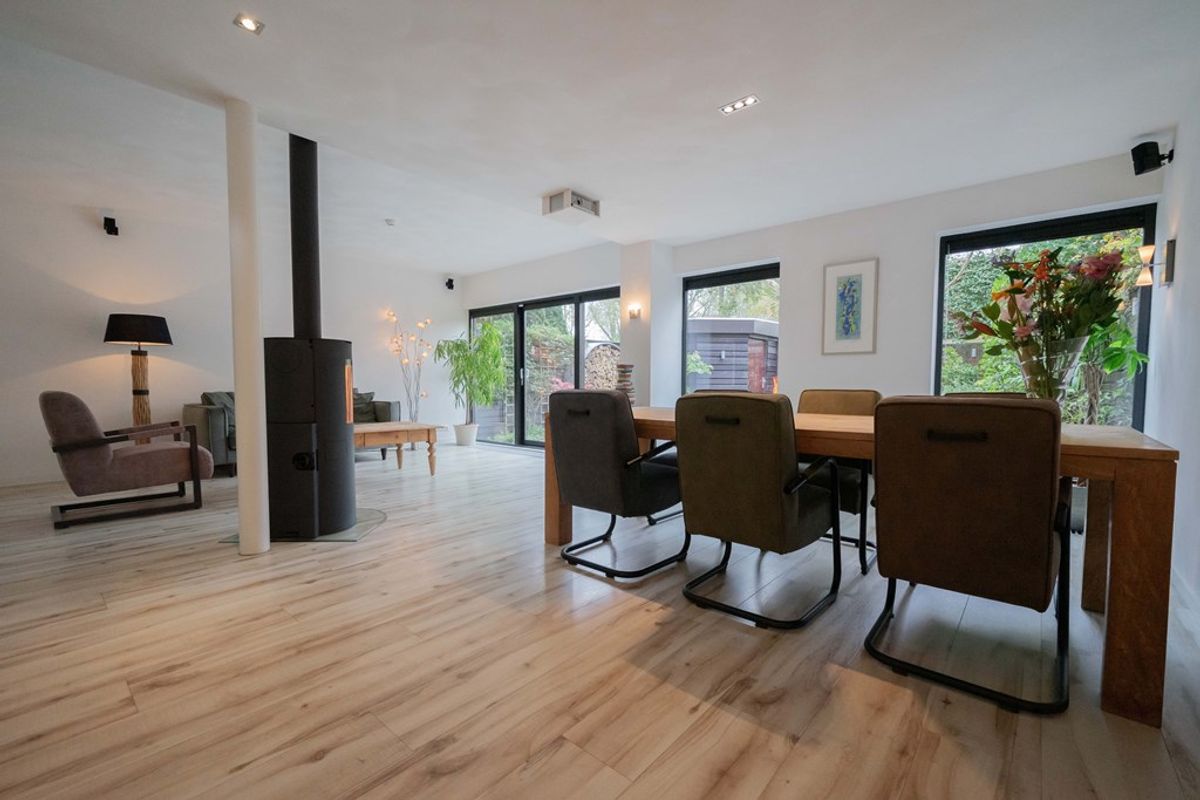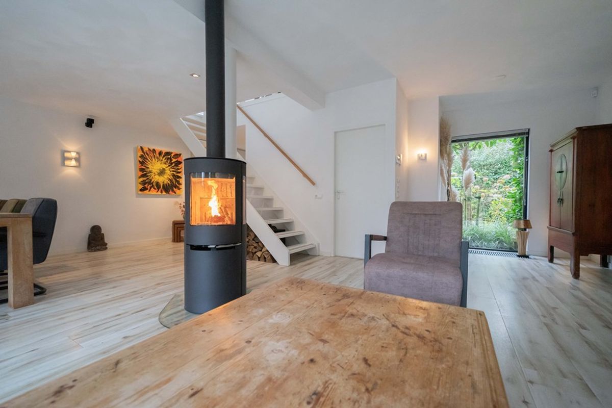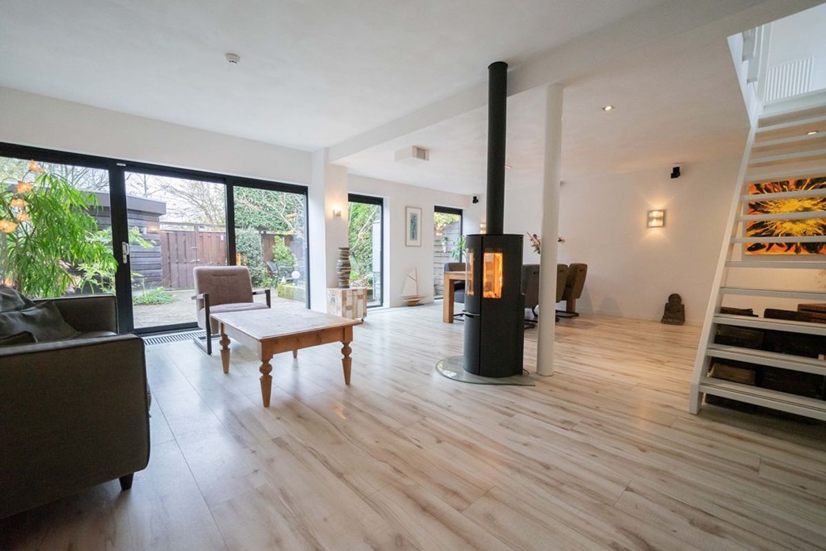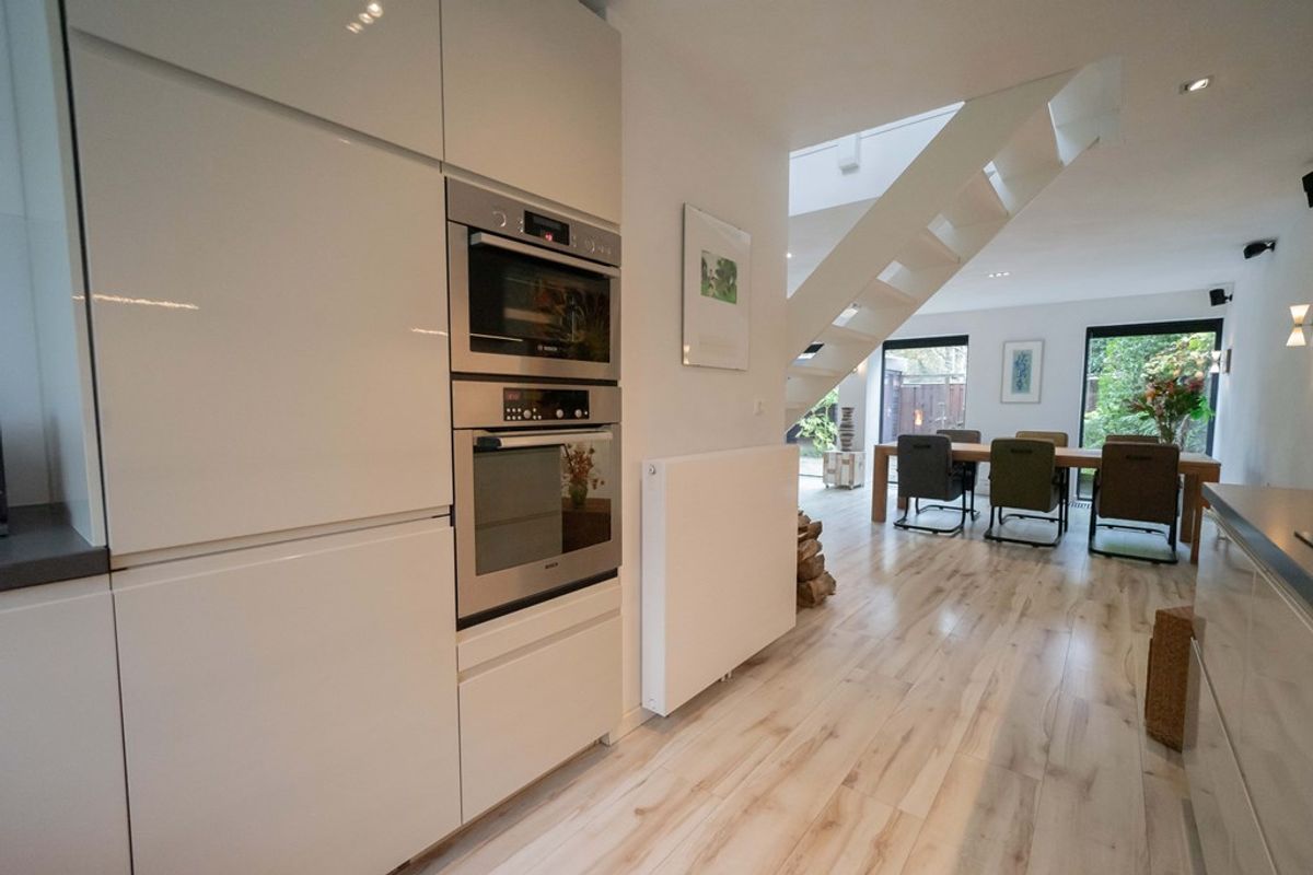 Bij binnenkomst in de woning wordt u verwelkomd door een ruime hal, die toegang biedt tot het toilet, de meterkast en de woonkamer. De royale woonkamer straalt warmte en gezelligheid uit, dankzij de fraaie afwerking, de hybride hout/pelletkachel en de grote raampartijen aan zowel de voor- als achterzijde. Tijdens een grondige renovatie is een zeer ruime leefruimte gecreëerd. De luxe open keuken is een droom voor iedere kookliefhebber. Met een strakke afwerking en hoogwaardige inbouwapparatuur, waaronder een inductiekookplaat, afzuigkap, combioven, vaatwasser en een koel- vriescombinatie, heeft deze keuken alles wat u nodig heeft voor zowel doordeweekse maaltijden als uitgebreide diners. De open verbinding met de woonkamer maakt dit een ideale plek om te koken terwijl u in contact blijft met uw gezelschap.