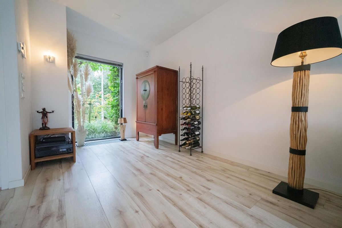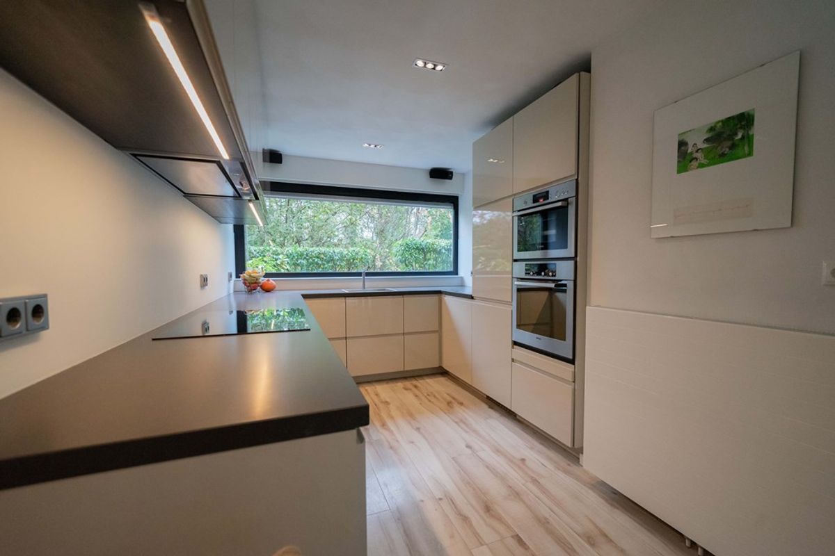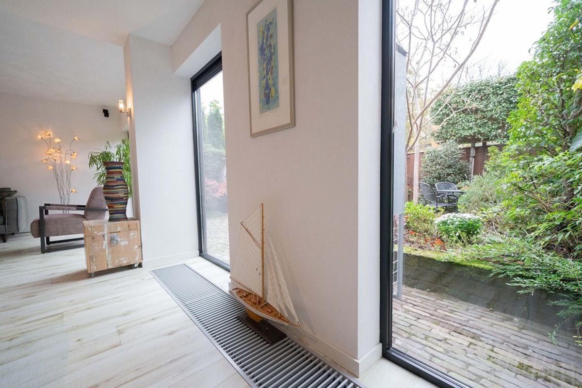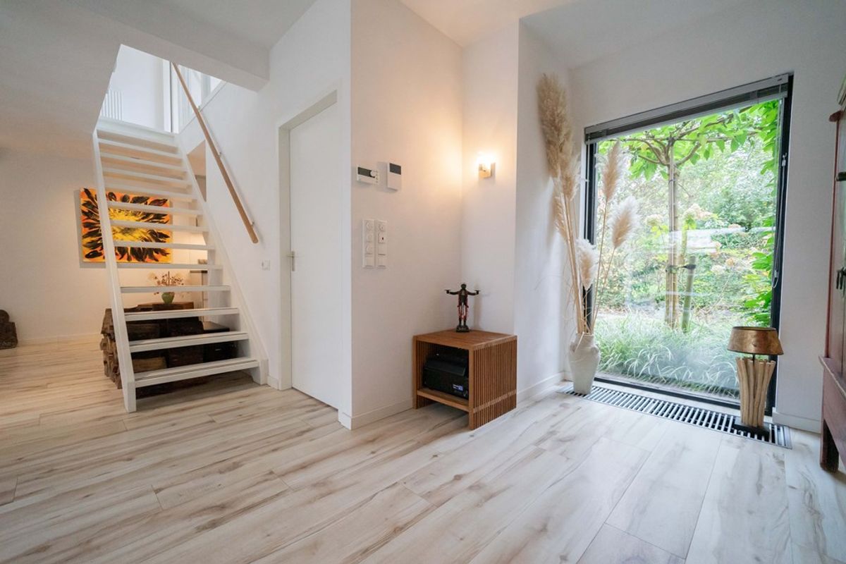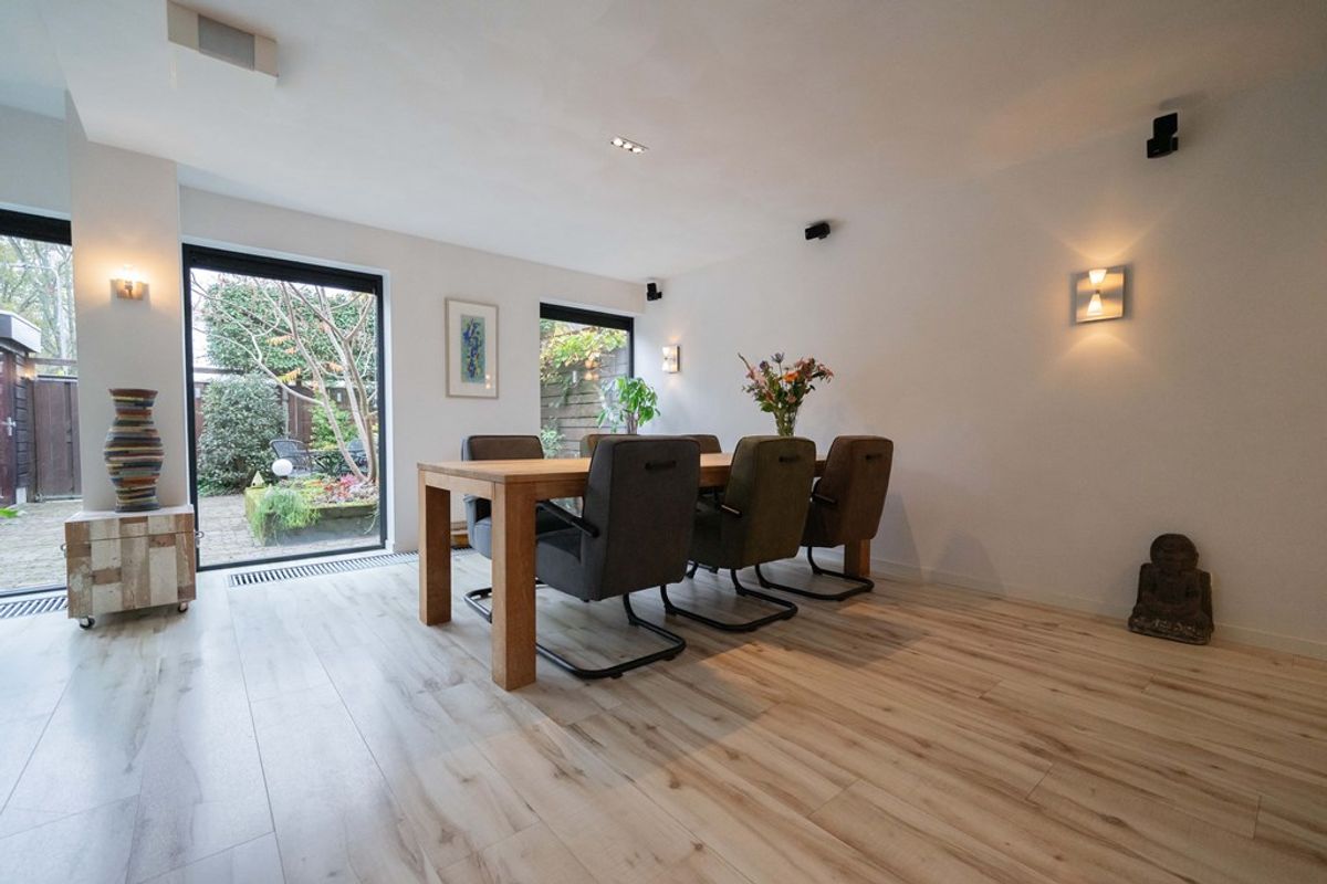 Bij binnenkomst in de woning wordt u verwelkomd door een ruime hal, die toegang biedt tot het toilet, de meterkast en de woonkamer. De royale woonkamer straalt warmte en gezelligheid uit, dankzij de fraaie afwerking, de hybride hout/pelletkachel en de grote raampartijen aan zowel de voor- als achterzijde. Tijdens een grondige renovatie is een zeer ruime leefruimte gecreëerd. De luxe open keuken is een droom voor iedere kookliefhebber. Met een strakke afwerking en hoogwaardige inbouwapparatuur, waaronder een inductiekookplaat, afzuigkap, combioven, vaatwasser en een koel- vriescombinatie, heeft deze keuken alles wat u nodig heeft voor zowel doordeweekse maaltijden als uitgebreide diners. De open verbinding met de woonkamer maakt dit een ideale plek om te koken terwijl u in contact blijft met uw gezelschap.