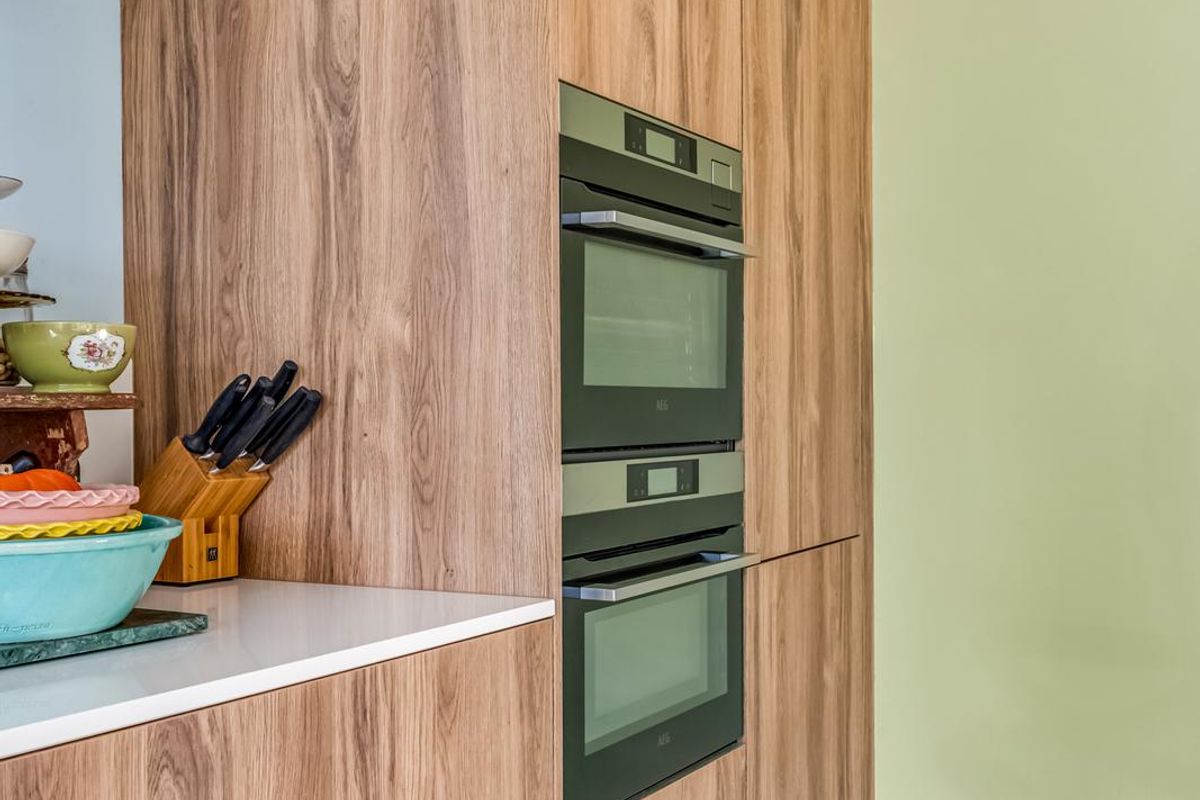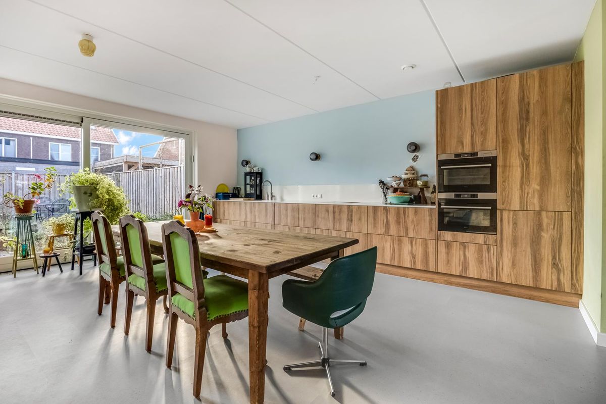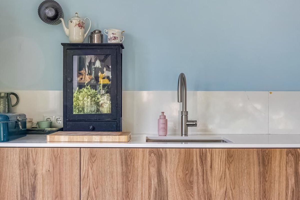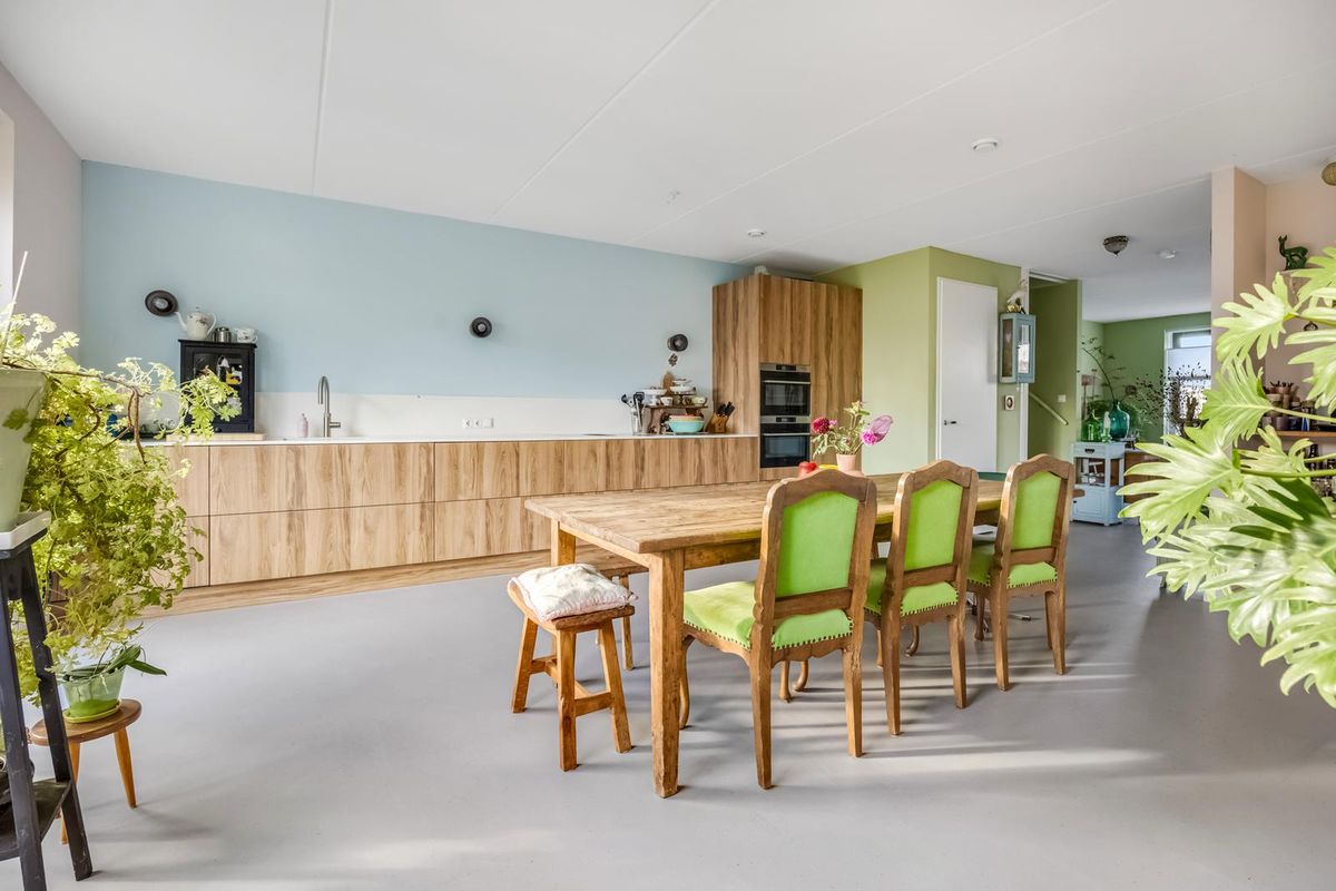De keuken loopt over de hele lengte van de ruimte en heeft een strakke houtlook die meteen opvalt. Aan de andere kant van de keuken zit een extra hoekje dat je op allerlei manieren kunt gebruiken: als speelhoek, werkplek of juist als knusse zithoek voor een kop koffie. Zo maak je de ruimte helemaal passend bij jouw dagelijkse ritme.