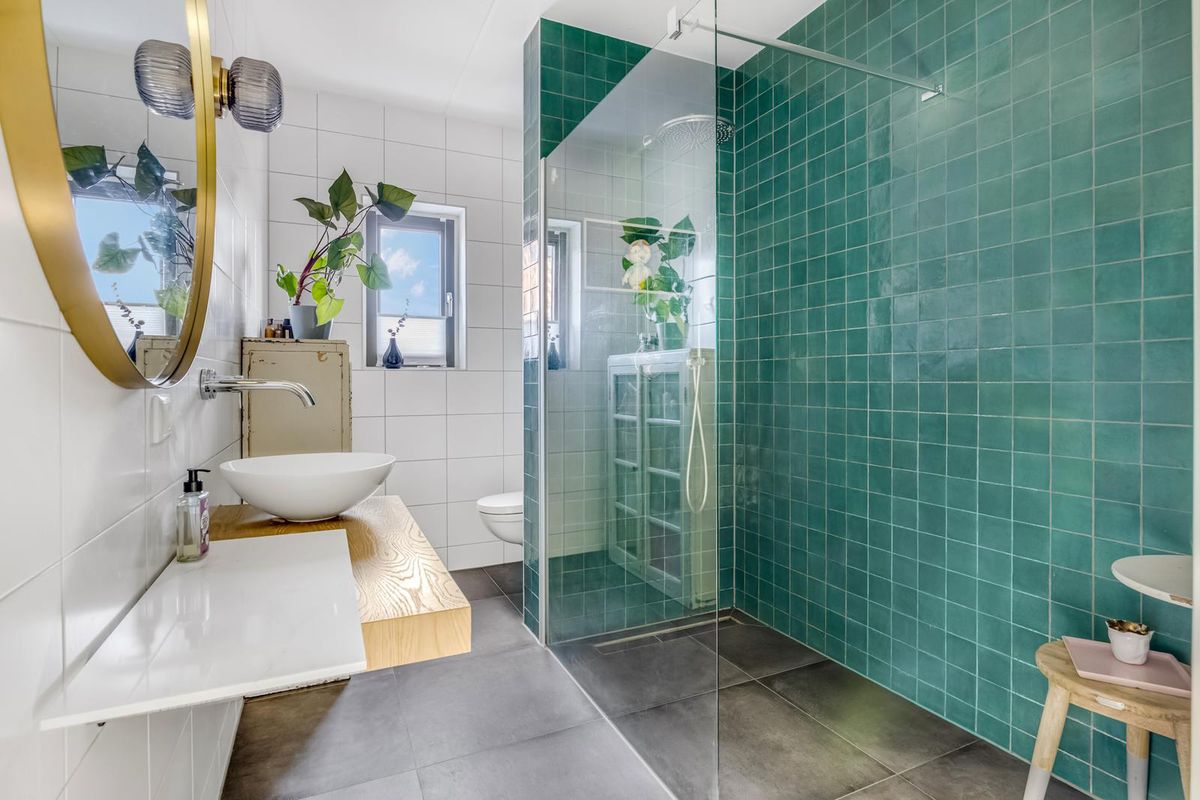 De badkamer voelt als een privé spa met een moderne inloopdouche en stijlvol tegelwerk. De dubbele ramen zorgen voor een heerlijke lichtinval en ventilatie, perfect voor een frisse start van de dag.