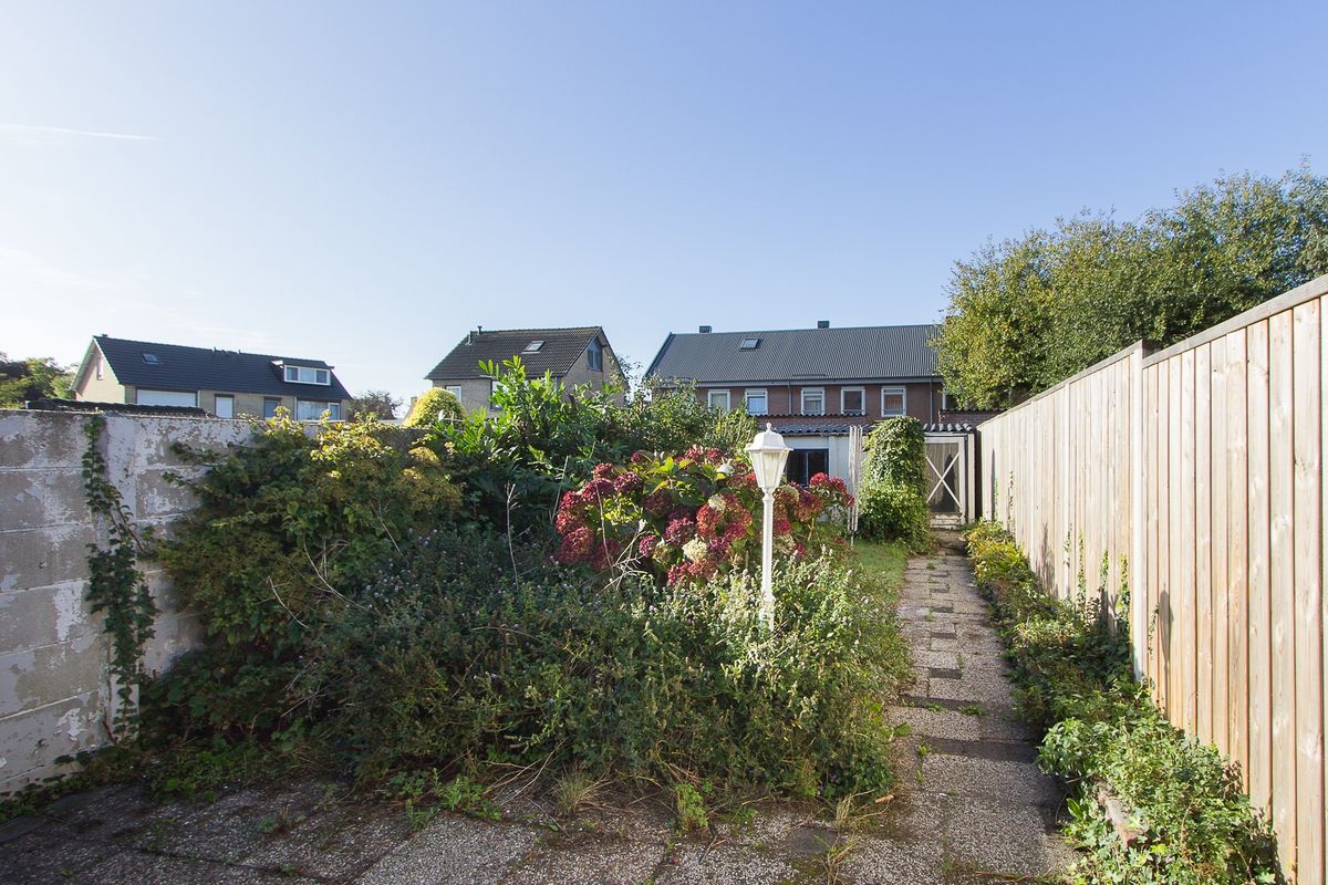 De tuin is groen ingedeeld met verschillende planten, bomen en een terras. De omsloten achtertuin is voorzien van een eigen achterom.