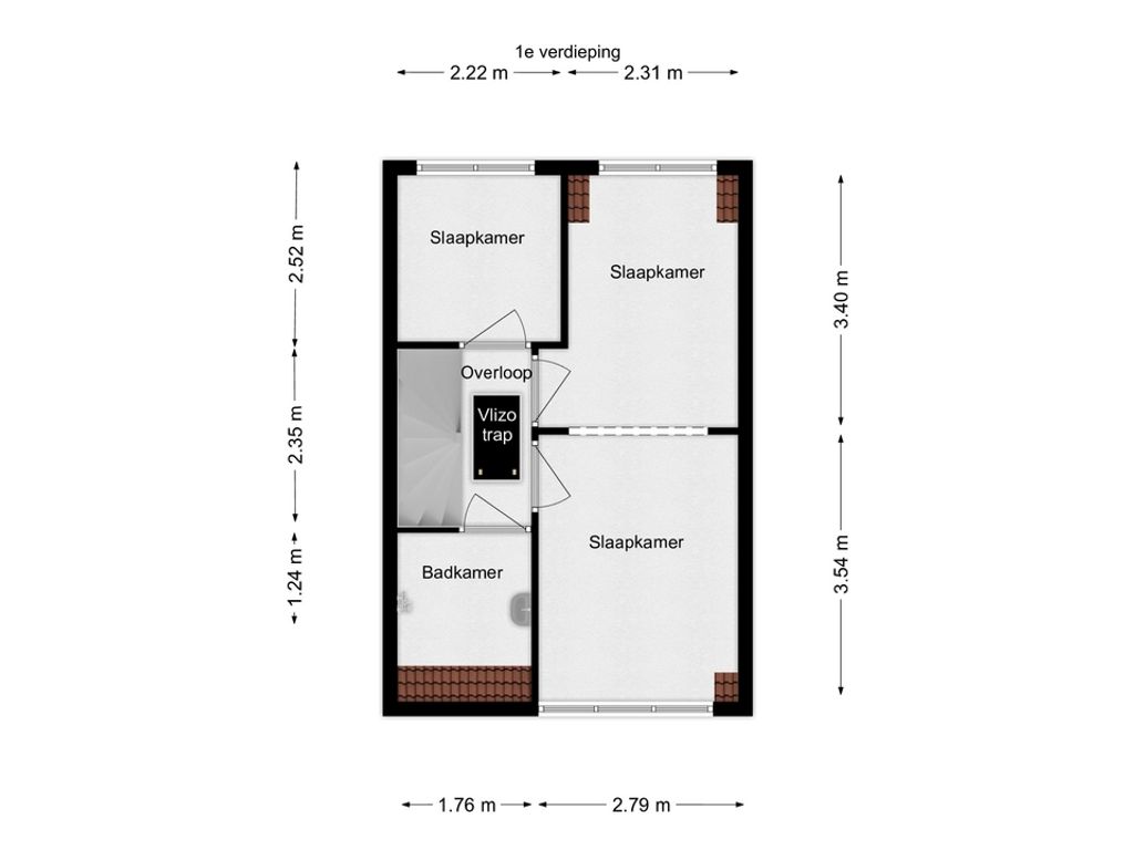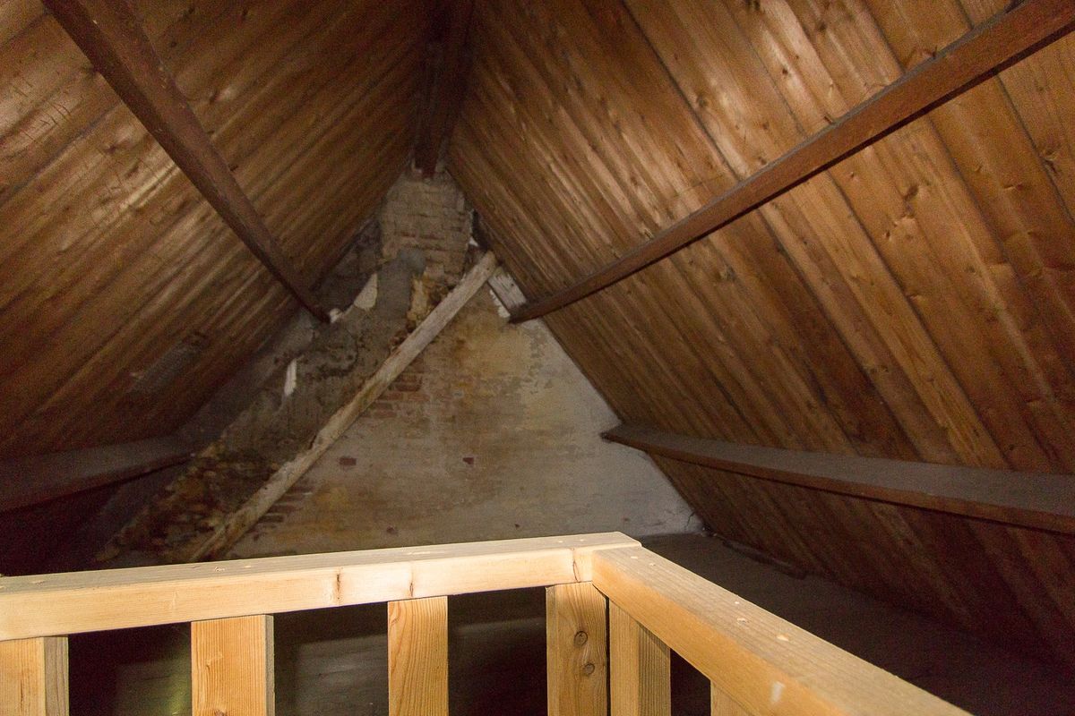 Overloop met vlizotrap naar de bergzolder, 2 slaapkamers en een badkamer met ligbad en wastafelmeubel.