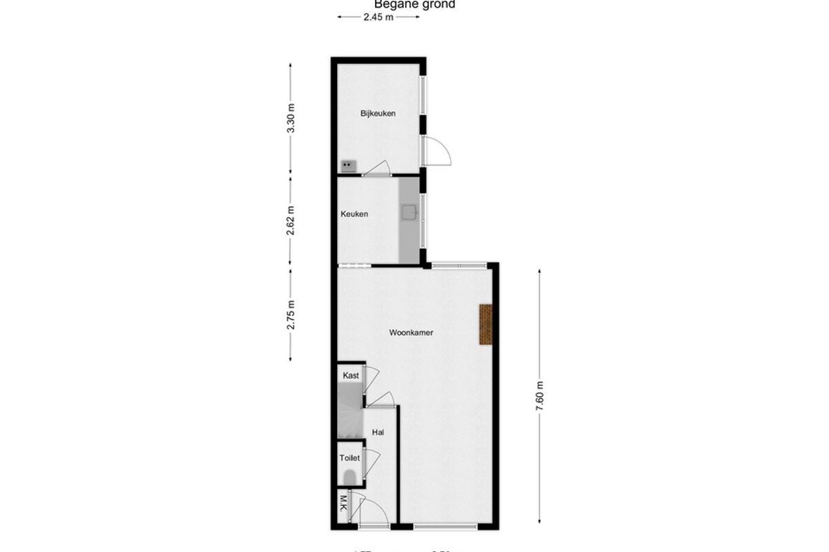 Hal met meterkast en trapopgang naar de verdieping, trapkast, toilet, woonkamer, dichte keuken met een rechte opstelling, bijkeuken met CV-opstelling, badkamer met douche en een loopdeur naar de tuin.