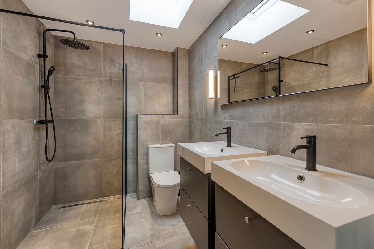 De badkamer is in 2022 vernieuwd en straalt luxe en comfort uit. Voorzien van een inloopdouche met stort- en handdouche, een dubbele wastafel in meubel, sfeervolle inbouwspots en natuurlijk daglicht via de lichtkoepel. Een heerlijk begin van de dag!