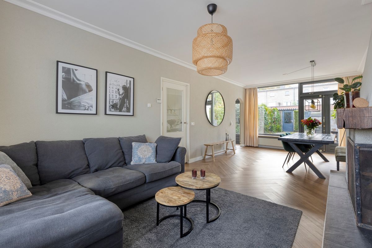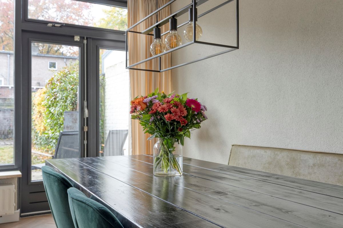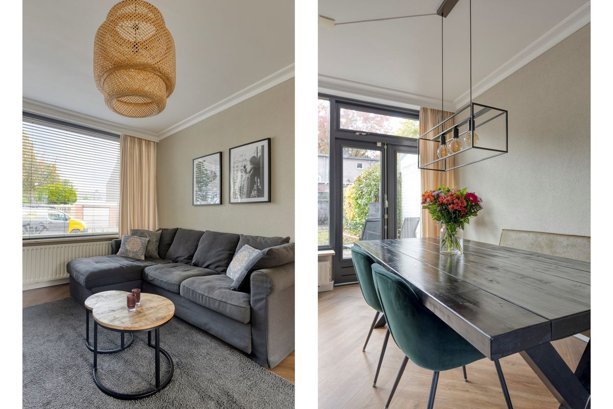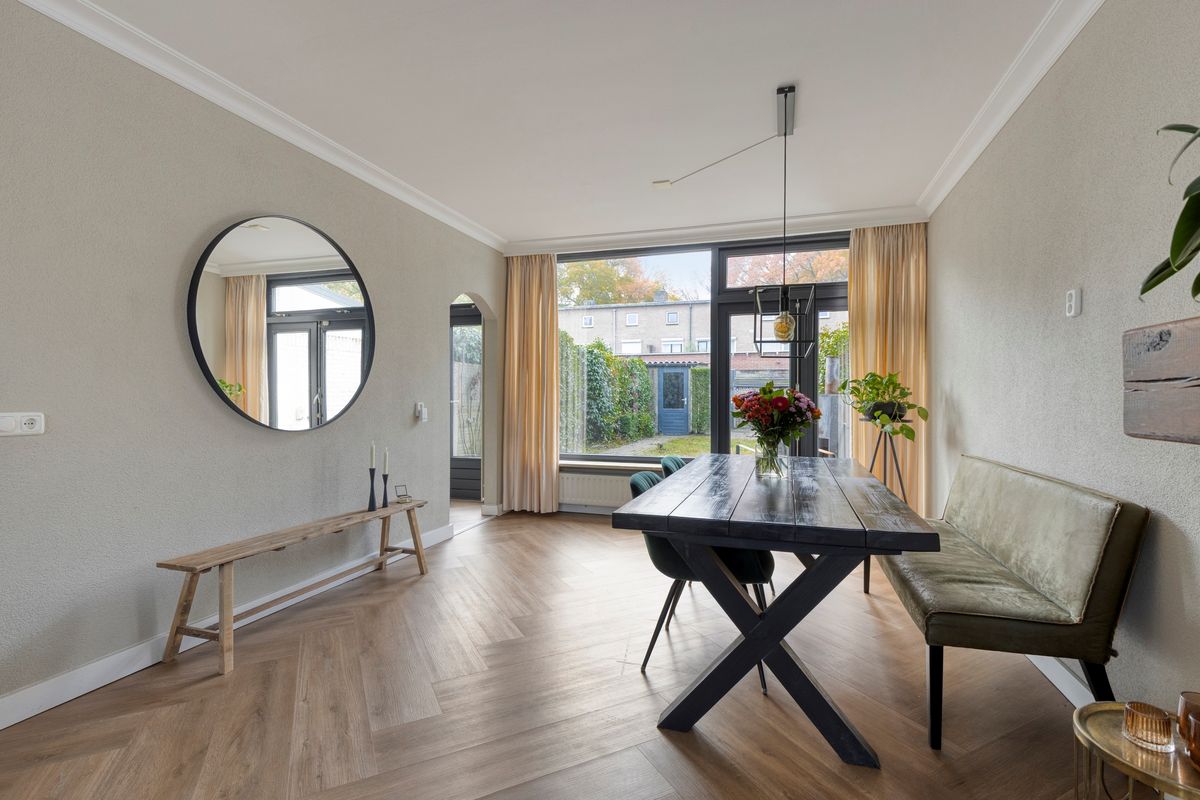 In de woonkamer valt meteen de heerlijke hoeveelheid lichtinval op en de warme sfeer. Aan de voorzijde vind je het zitgedeelte met een karakteristieke schouw en open haard terwijl de eethoek aan de achterzijde uitkijkt op de tuin. De gehele benedenverdieping is afgewerkt met een fraaie PVC visgraatvloer.