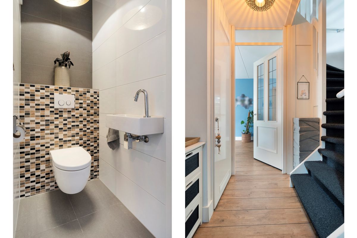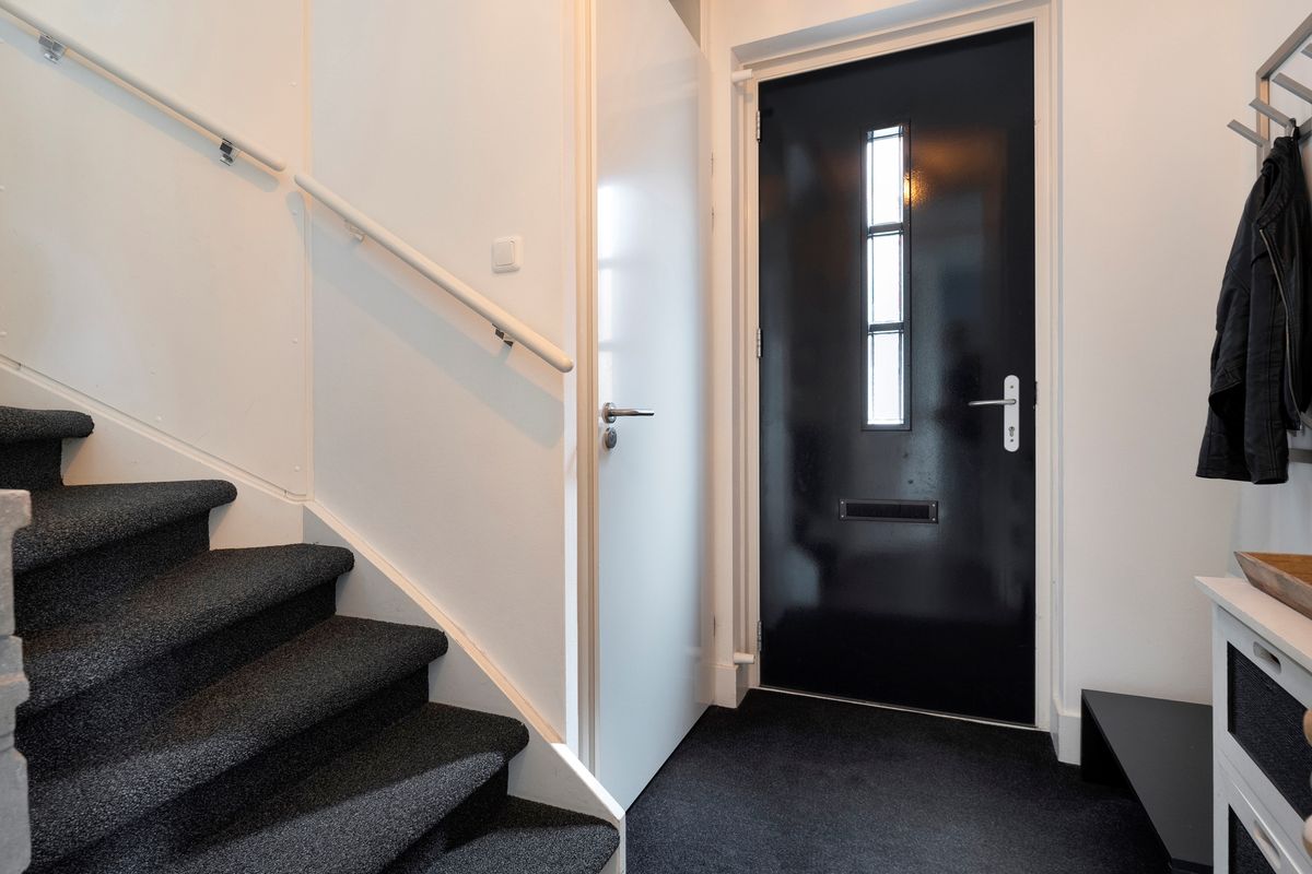 Middels entree betreedt men de hal met trapopgang, meterkast en toilet met fonteintje.