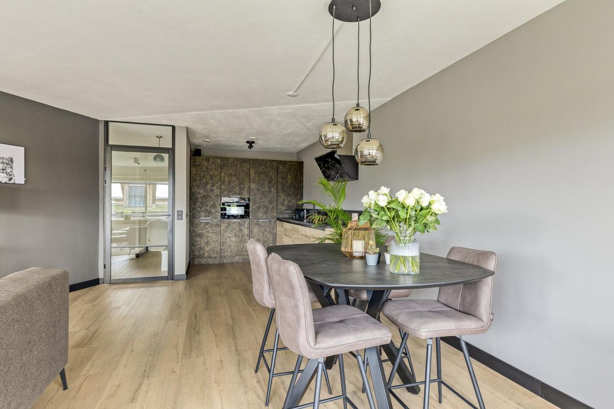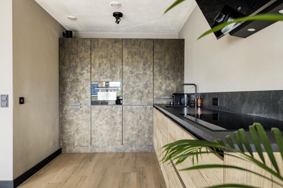 De woonkamer is echt een plaatje: ruim, modern en met veel lichtinval dankzij de grote ramen. De PVC vloer en strak gestucte wanden zorgen voor een eigentijdse uitstraling. De ruimte is groot genoeg voor een comfortabele zithoek, een gezellige eethoek én zelfs een werkplek. De open keuken sluit perfect aan op de stijl van de woning. Met een donker keukenblad, houtlook kasten en alle nodige inbouwapparatuur (koelkast, vriezer, vaatwasser, combi-oven en inductiekookplaat) is dit een heerlijke plek om te koken én te genieten.
