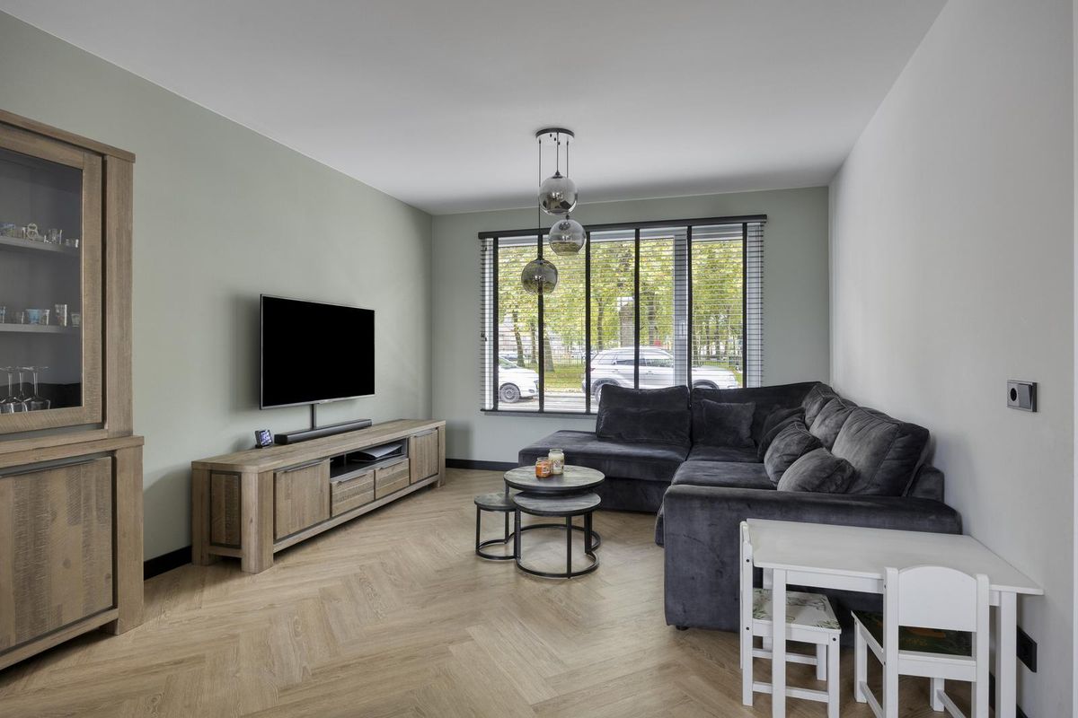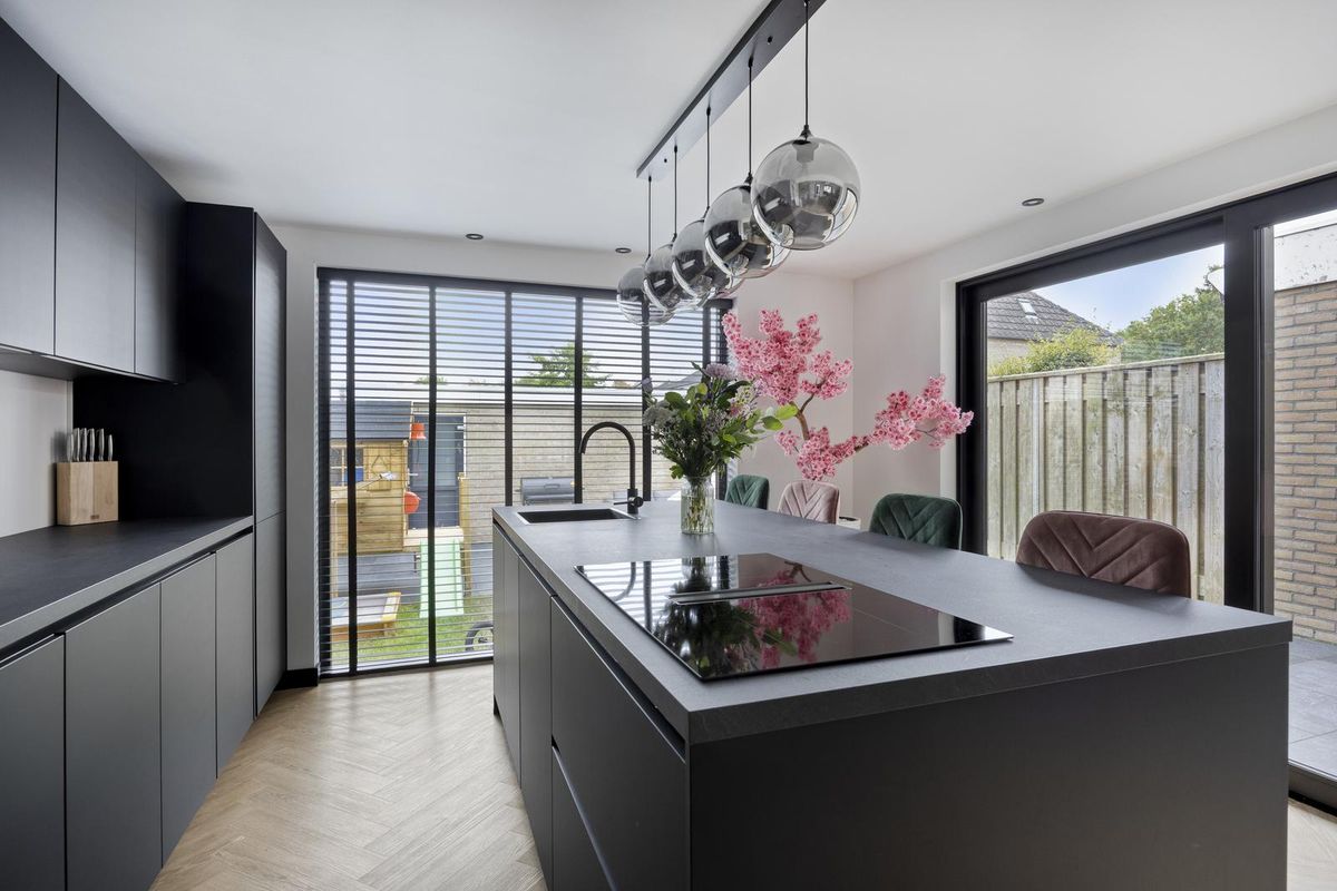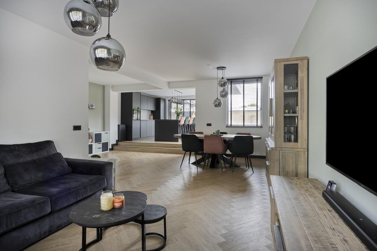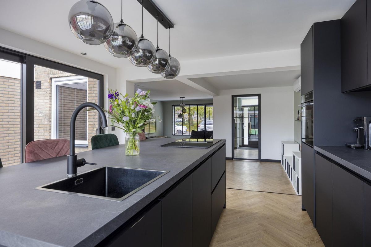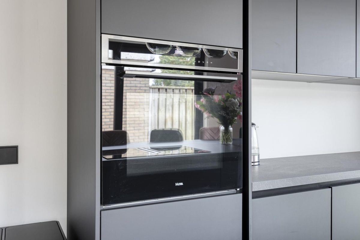 Zodra je binnenstapt, valt het oog direct op de prachtige stalen deur die de woonkamer een stijlvolle uitstraling geeft. De ruimte voelt licht, fris en uitnodigend aan. De open keuken, vernieuwd in 2023, vormt het hart van het huis en is uitgevoerd met een modern keukenmeubel en hoogwaardige inbouwapparatuur, waaronder een 4-pits inductiekookplaat met geïntegreerde afzuiging, een combi-oven, vaatwasser en koel-/vriescombinatie. Hier is koken niet zomaar een dagelijkse bezigheid, maar een plezierige ervaring.