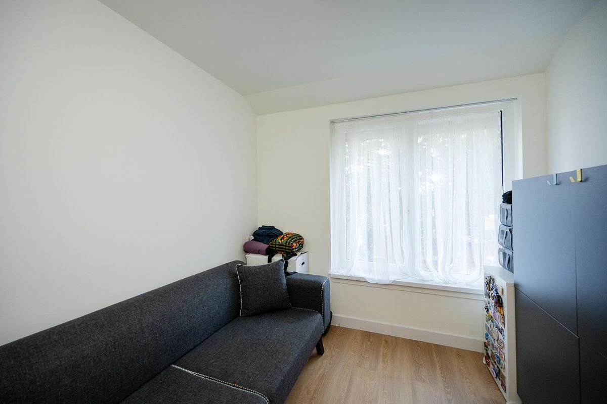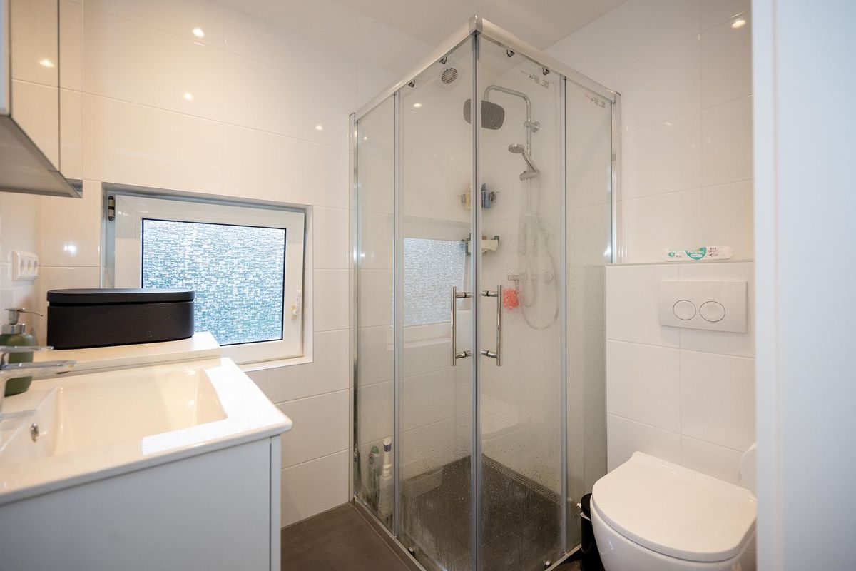 Hier bevinden zich drie slaapkamers en een moderne badkamer, volledig gerenoveerd en voorzien van een douche, toilet en wastafel met spiegel.