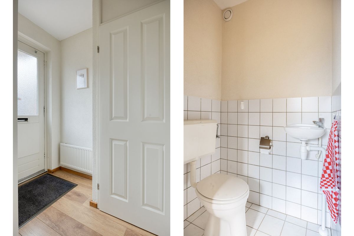 De woning wordt aan de voorzijde middels een kleurrijk beklinkerd voortuintje (overdekt) betreden via de entree/hal, waar zich de meterkast en deels betegelde toiletruimte met staand toilet en fonteintje bevinden. De entree/hal is keurig afgewerkt met een laminaatplankenvloer, licht gespacte wanden, paneeldeuren en een stucwerk plafond. Via een loopdeur komt men in de woonkamer, die door de gerealiseerde uitbouw (2006) een mooie oppervlakte van zo’n 37m² heeft gekregen en die is ingericht met een op de voor-/straatzijde gericht comfortabel zitgedeelte en een op de achtertuin georiënteerde royale eethoek. Ook bevindt zich in de woonkamer de toegangsdeur naar een klein portaal waar zich de trapopgang en de (afsluitbare) trap-/provisiekast bevinden. De aanwezige raampartijen zorgen voor veel lichtinval in de woonkamer, hetgeen haar tot een extra aangename verblijfsruimte maakt! Ook de woonkamer is afgewerkt met dezelfde keurige laminaatplankenvloer, licht gespacte wanden en een strak stucwerk plafond, met in dit geval sierlijsten. De half open keuken is het verlengstuk van de eethoek en biedt naast de nodige kast- en laderuimte plaats aan verschillende keukenapparatuur zoals een koelkast, gaskookplaat, afzuigkap, vaatwasser, oven en magnetron. De aansluitende bijkeuken is een ideale bergruimte waar ook het witgoed opgesteld kan worden. Ook vormt de bijkeuken een ideale droogloop vanuit de achtertuin.