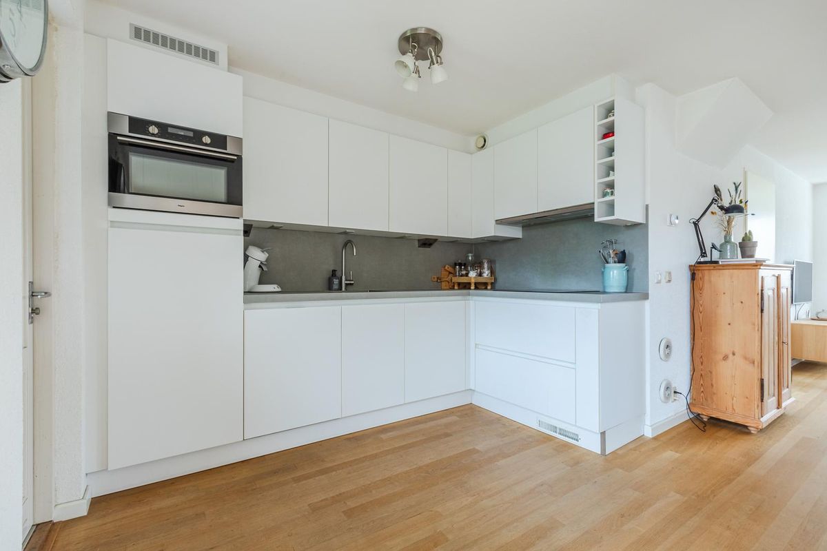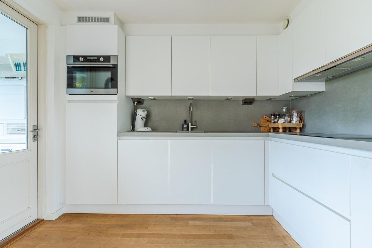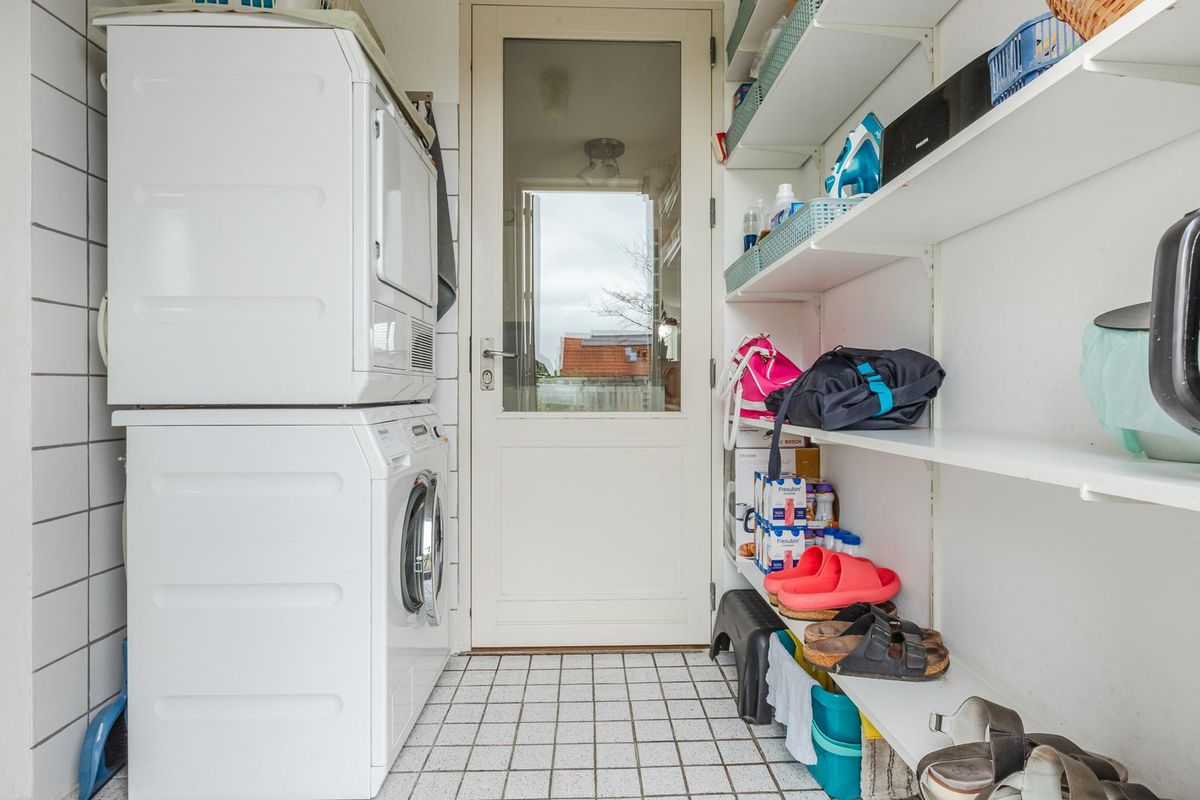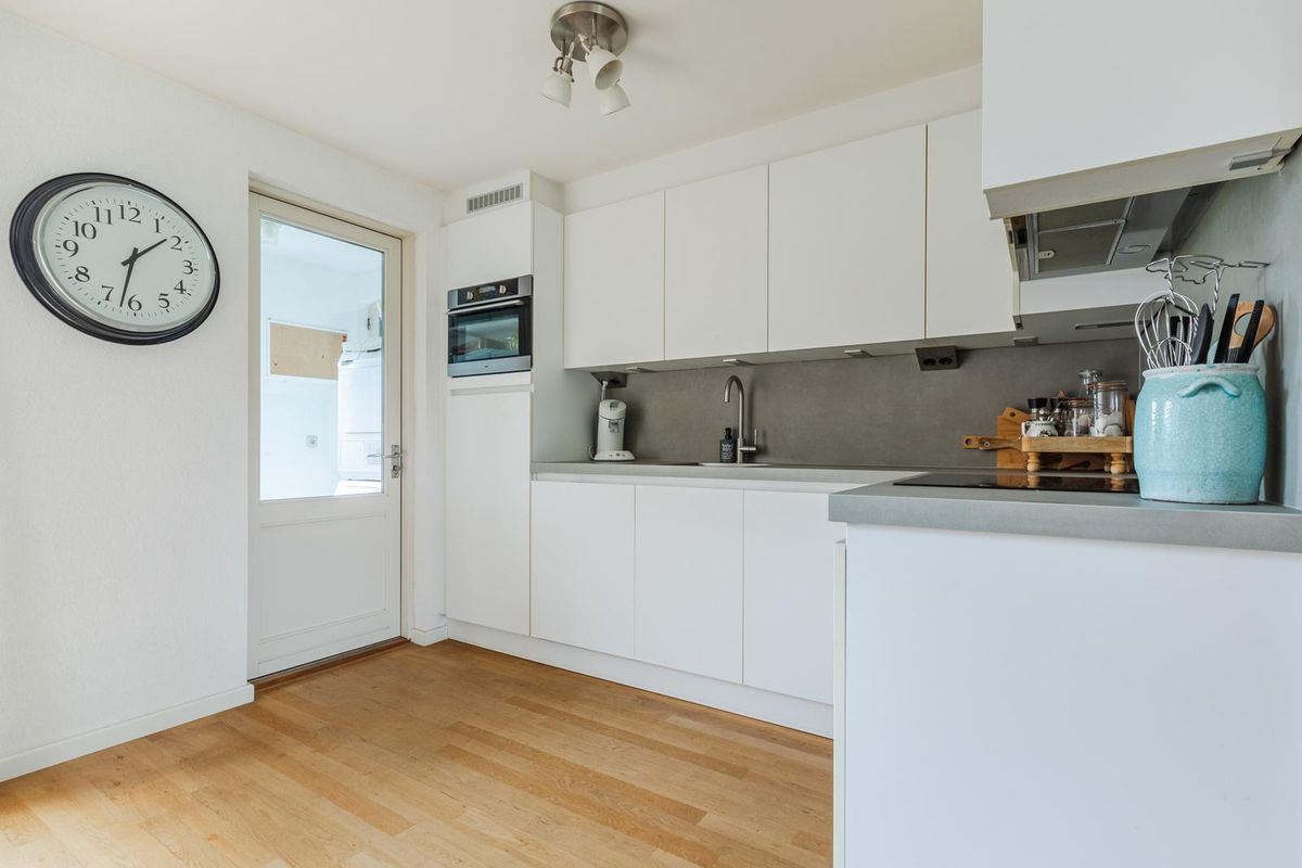 De moderne, open keuken bevindt zich aan de achterzijde van de woning en is in een L-vormige opstelling geplaatst met veel kastruimte en lades. De keuken is voorzien van de volgende inbouwapparatuur: keramische kookplaat, afzuigkap, koelkast, combi oven/magnetron en vaatwasser. Aangrenzend ligt de bijkeuken, ideaal als extra bergruimte en het plaatsen van wasmachine en droger. Vanuit hier heb je toegang tot de tuin en de berging. De voormalige garage is verdeeld in 2 handige bergruimtes. Aan de voorzijde is de garagedeur nog aanwezig en is voldoende ruimte voor fietsen en andere opslag. Het achterste gedeelte is geïsoleerd en is naast bergruimte, ook geschikt als hobbyruimte.