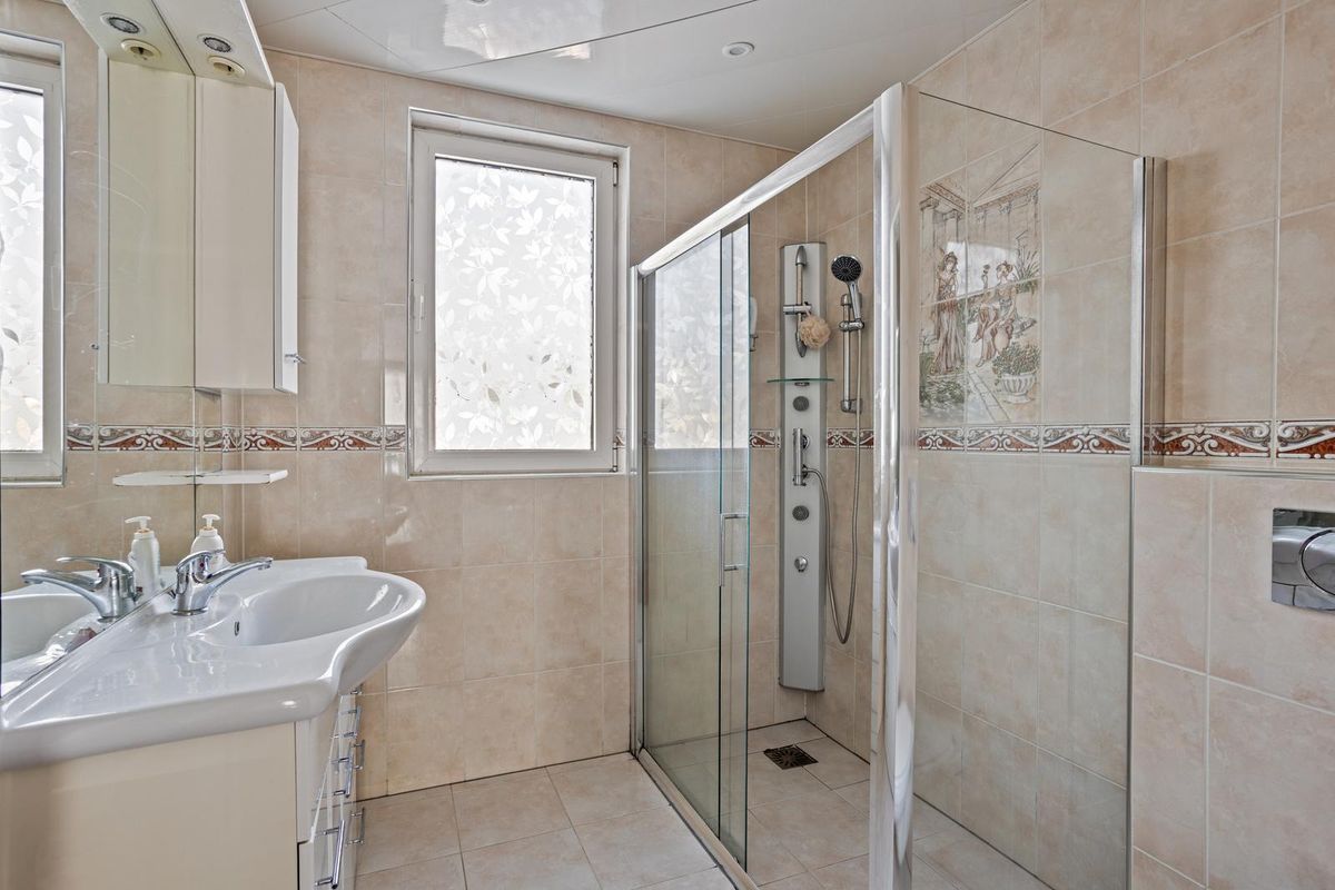 De badkamer is volledig afgewerkt met tegels in een beige kleurstelling en voorzien van een wastafel met meubel, ruime inloopdouche, tweede toilet en een spiegel.