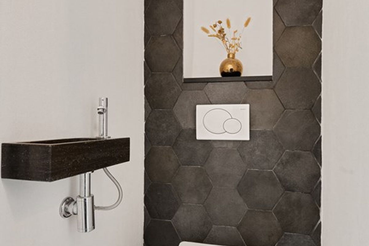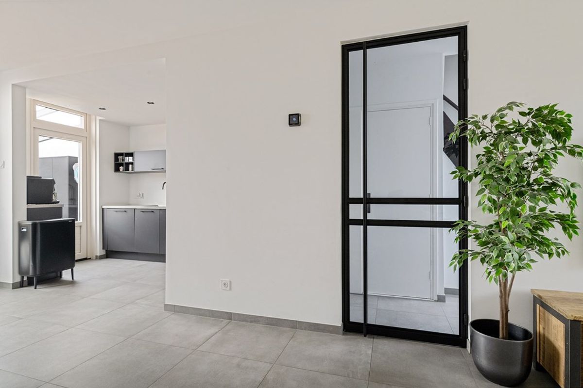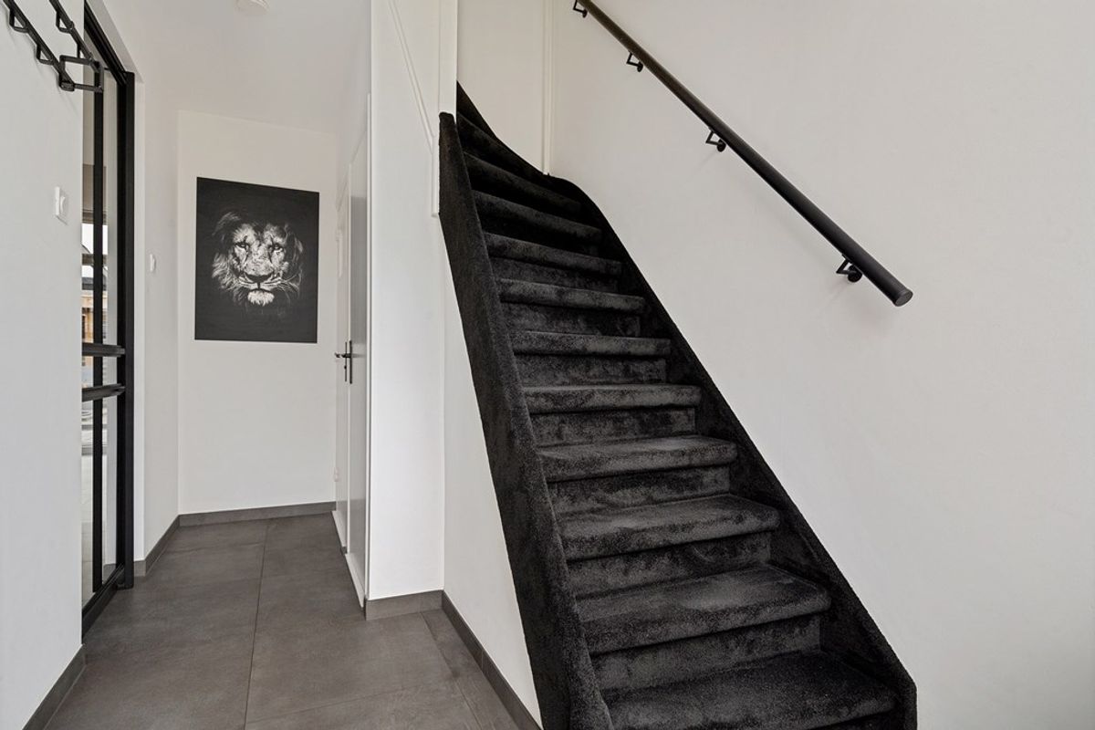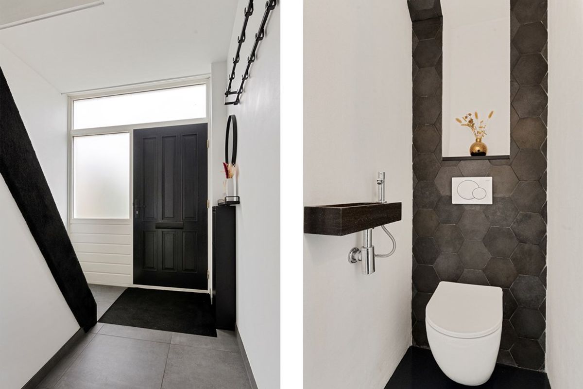 Je komt binnen in een ruime entree. Direct aan de rechterkant vind je de trapopgang naar de eerste verdieping. Loop je de gang verder in, dan zit aan de rechterzijde eerst een handige trappenkast en iets verderop een mooi afgewerkt toilet.