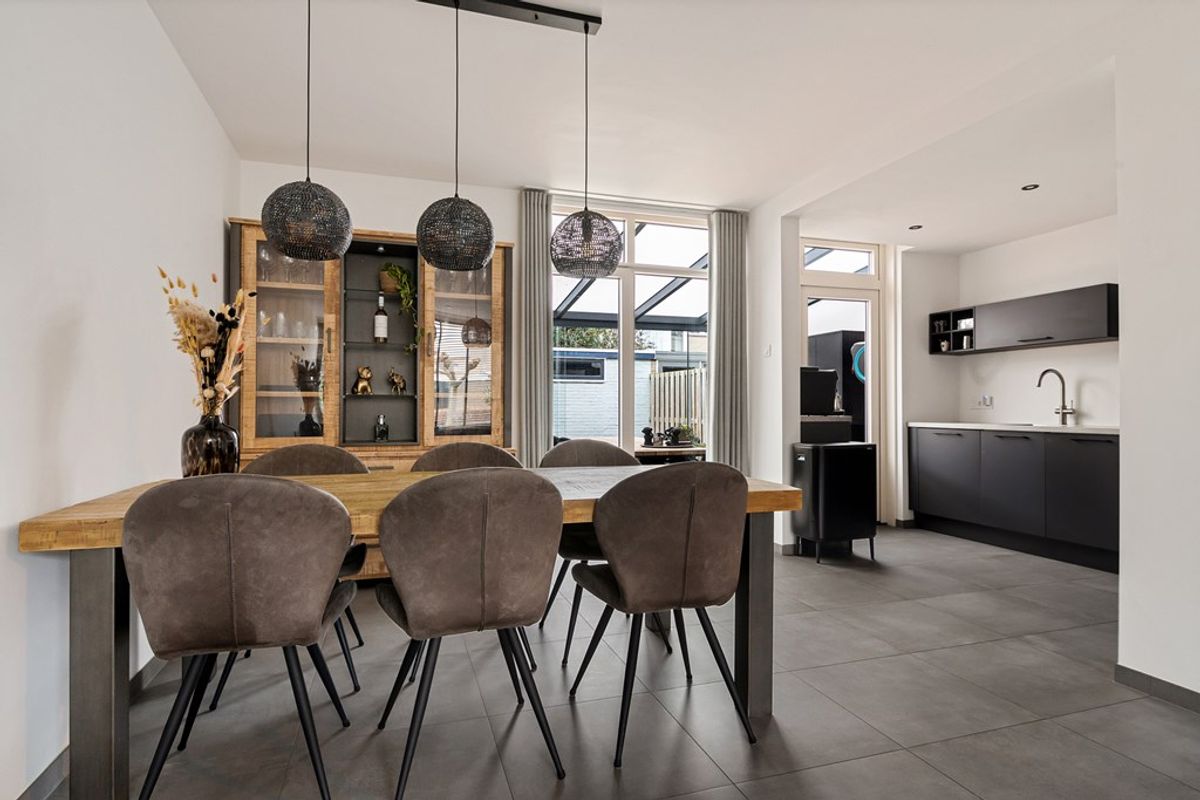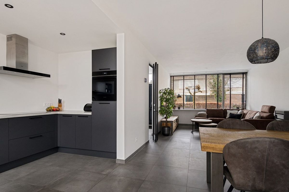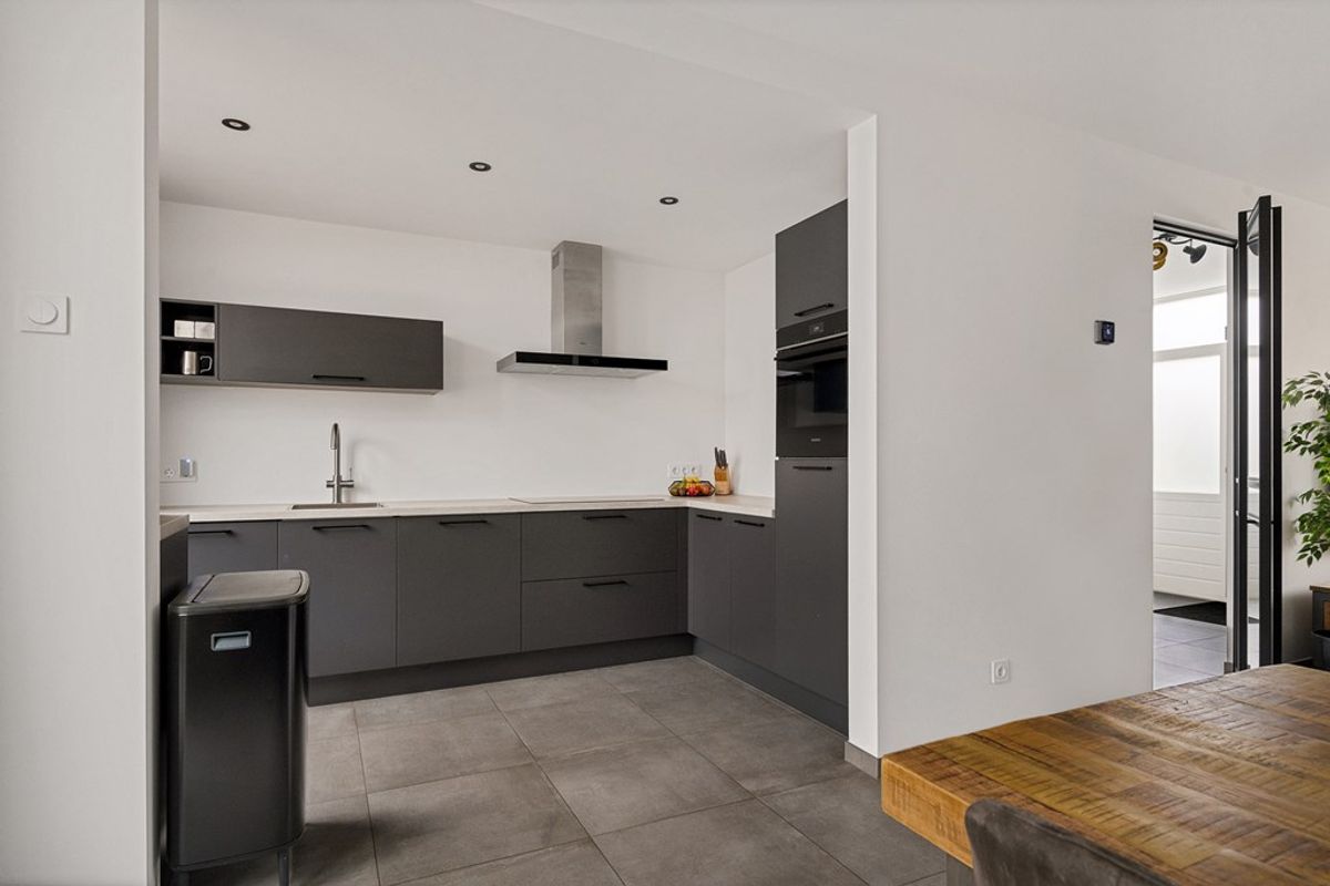 Aan de linkerkant stap je de ruime, lichte woonkamer binnen: een prettige leefruimte met voldoende plek voor een comfortabele zithoek én een eettafel. Achterin de woning vind je de keuken, die is uitgerust met vaatwasser, ijskast, inductiekookplaat, combioven/-magnetron (geplaatst in 2025), wastafel met kraan en afzuiging. Vanuit de keuken heb je bovendien direct toegang tot de serre een fijne extra ruimte ideaal voor in de lente en zomermaanden.