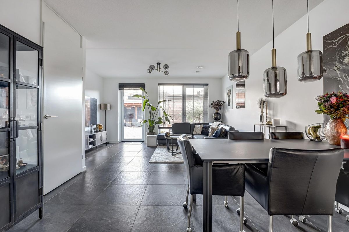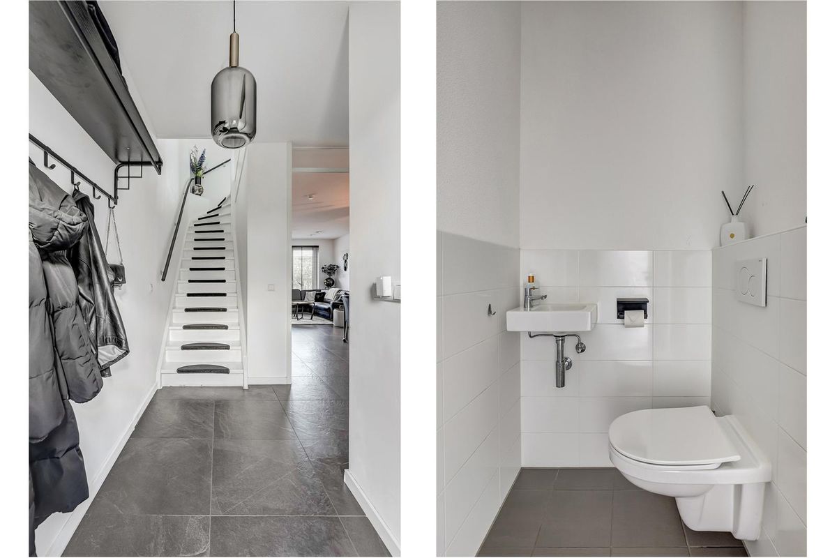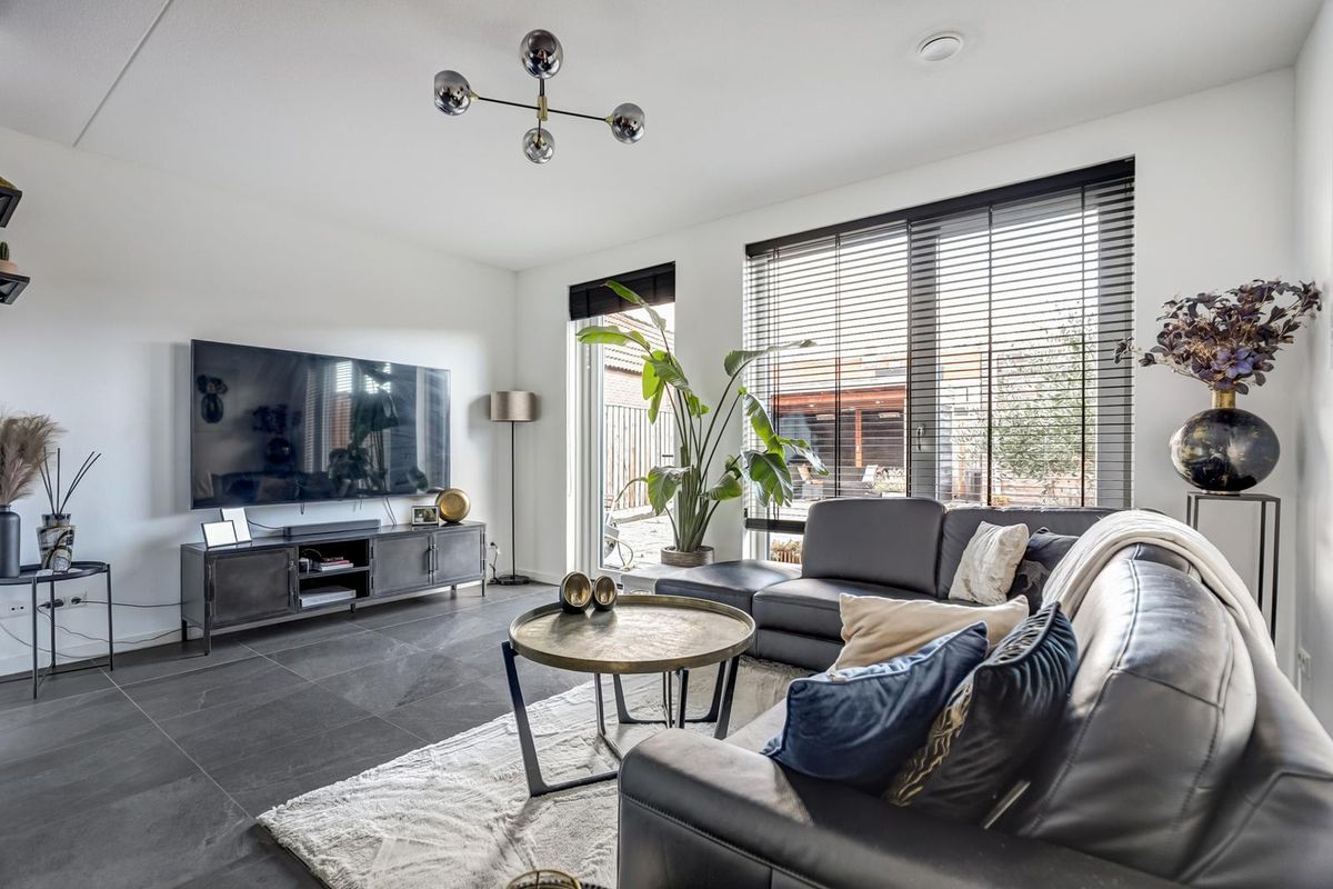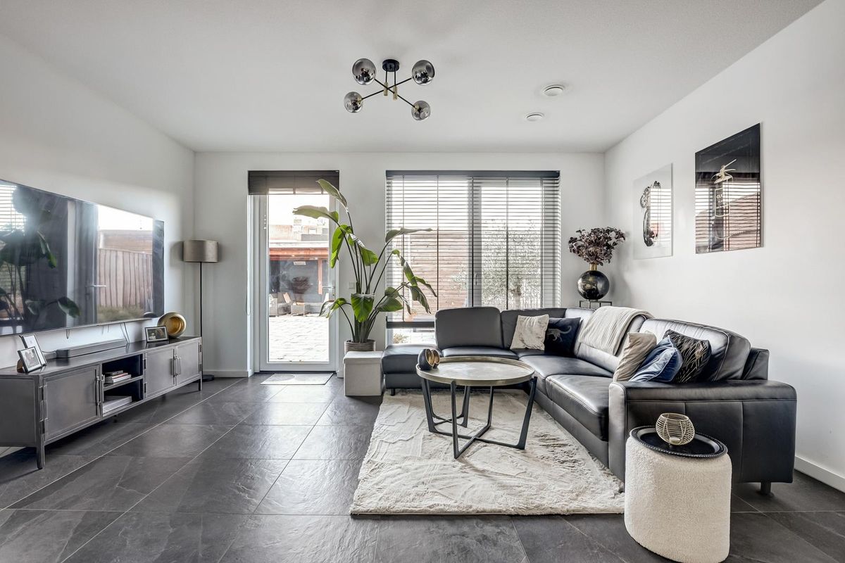 Via de nette voortuin betreedt u de woning in de hal met meterkast, toiletruimte en trapopgang. Vanuit hier komt u in de lichte woonkamer: een moderne leefruimte met grote raampartijen die zorgen voor veel daglicht en een prettig uitzicht op de tuin. De woonkamer is afgewerkt met een fraaie tegelvloer en strak gestuukte wanden, een perfecte basis voor elk interieur.