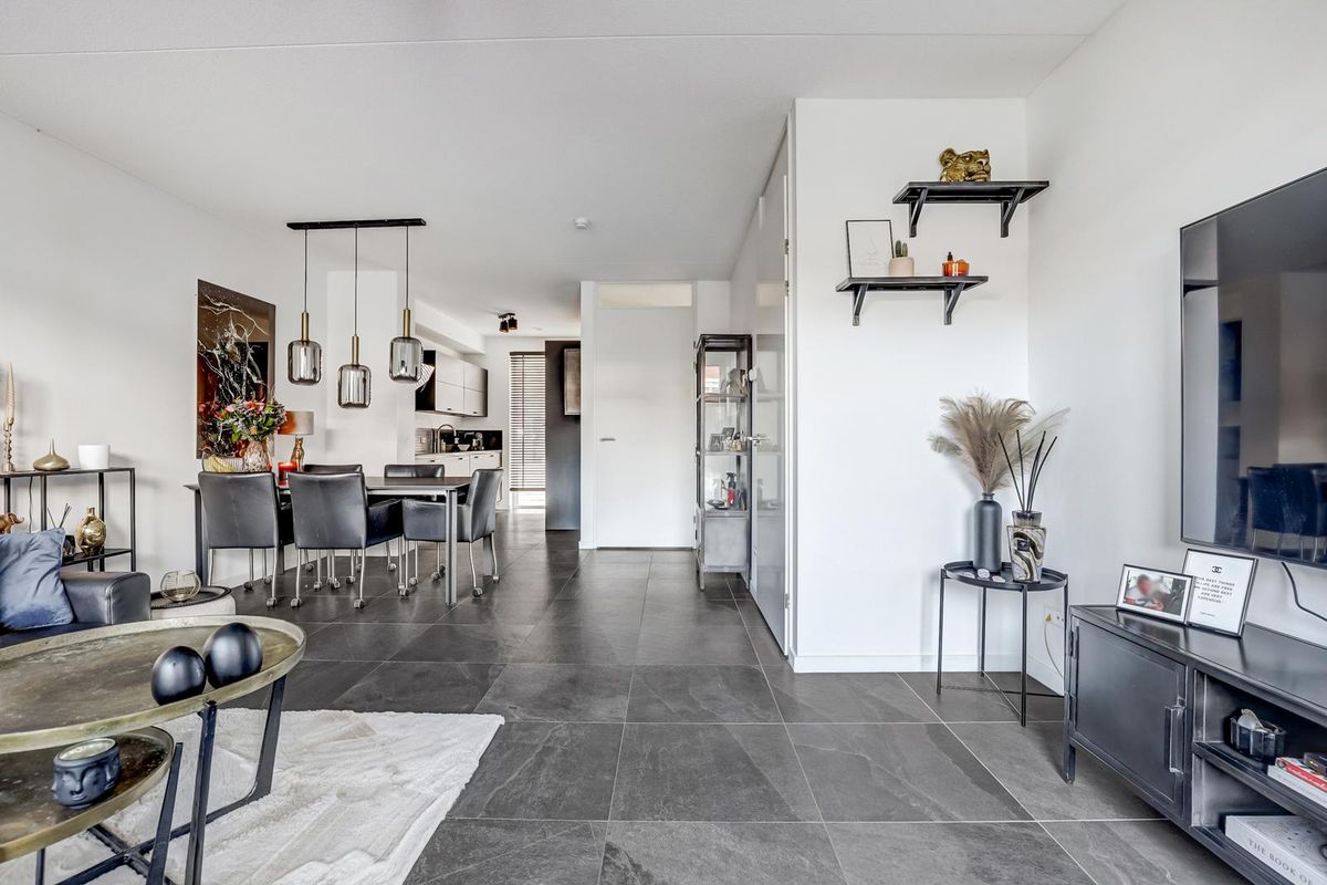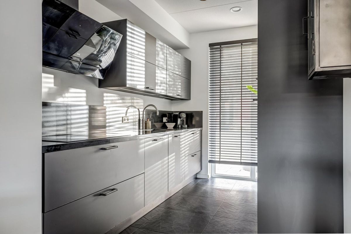 Aan de voorzijde bevindt zich de moderne keuken, uitgevoerd in een stijlvolle grijs-zwarte kleurstelling met een donker werkblad. De keuken is voorzien van diverse inbouwapparatuur zoals een inductiekookplaat, afzuigkap, combimagnetron, vaatwasser, koelkast en vriezer. De praktische opstelling en de vele opbergmogelijkheden maken dit een heerlijke plek voor kookliefhebbers.
