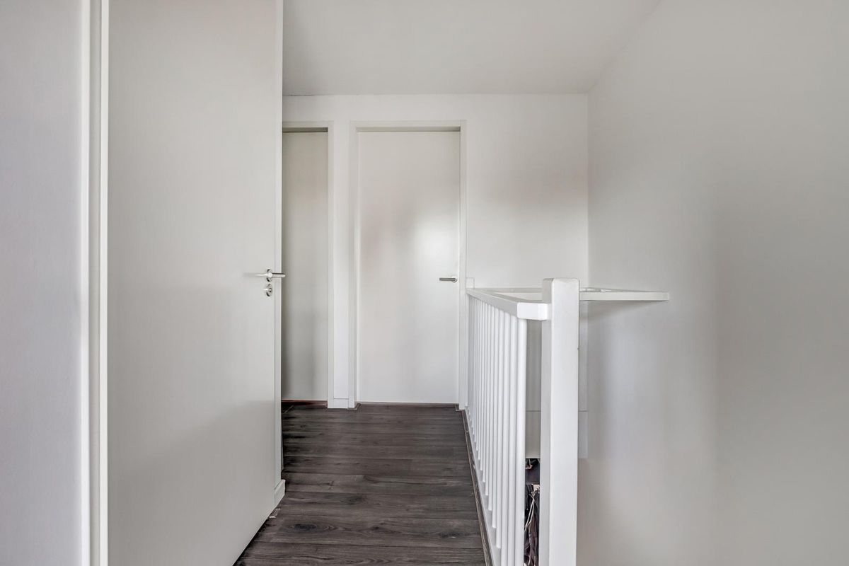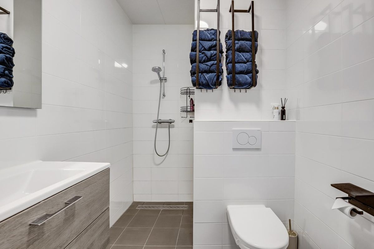 De badkamer is modern en compleet uitgevoerd met een inloopdouche, wastafelmeubel en tweede toilet. De strakke wand- en vloertegels geven de ruimte een frisse en tijdloze uitstraling. Tevens bevindt zich op deze verdieping een praktische bergkast met de aansluitingen voor de wasmachine en de cv-installatie.