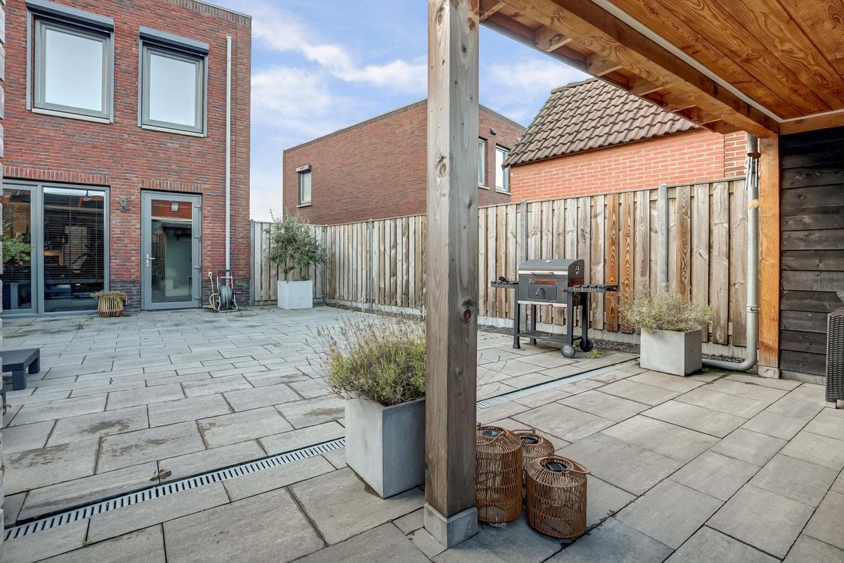 De achtertuin is onderhoudsvriendelijk aangelegd met sierbestrating en biedt veel privacy. Achterin de tuin bevindt zich een ruime houten berging met elektra, ideaal voor fietsen en tuingereedschap. Daarnaast is er een overkapping met zithoek, waar u ook op koelere avonden heerlijk buiten kunt zitten. Dankzij de ligging is er vrijwel de hele dag zon in de tuin.