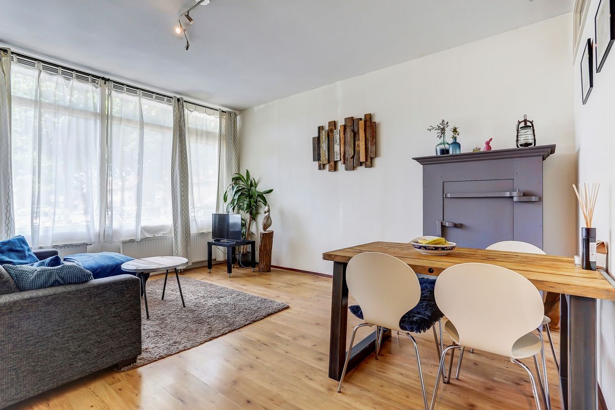 Via de hal kom je in de lichte, open woonkamer. De hoge raampartijen zorgen voor veel daglicht en een prettige sfeer. De woonkamer is netjes afgewerkt met een laminaatvloer en biedt voldoende ruimte voor een zit- en eethoek.
