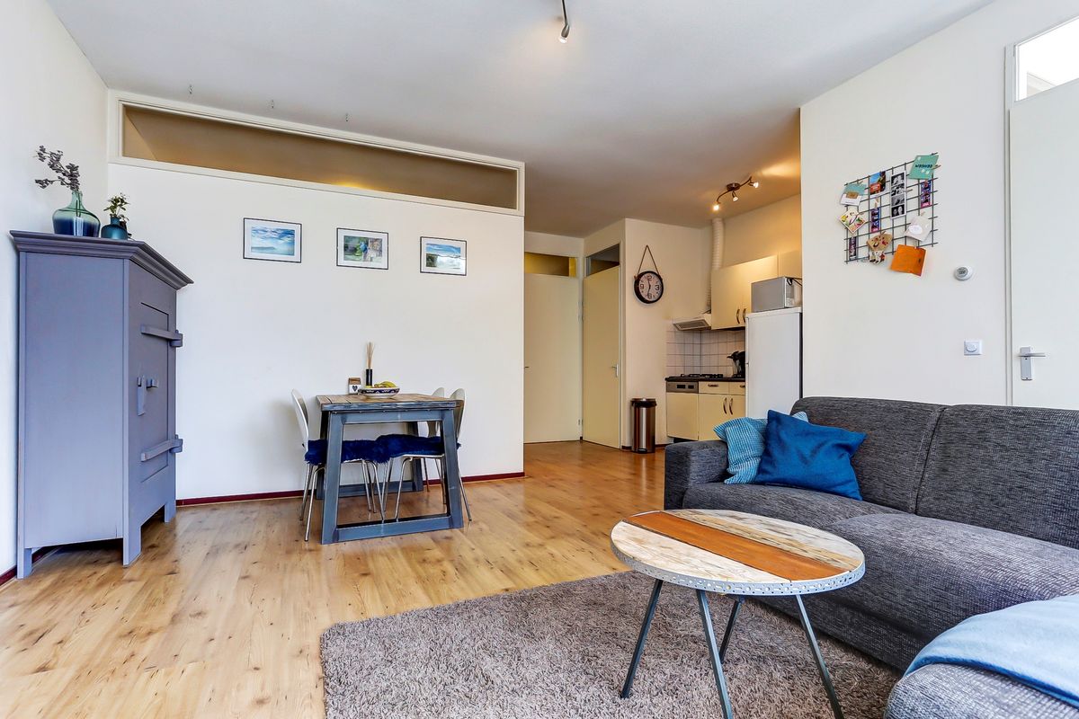 De woning beschikt over een lichte woonkamer met open inbouwkeuken en een ruime slaapkamer, wat zorgt voor een comfortabele en praktische indeling.