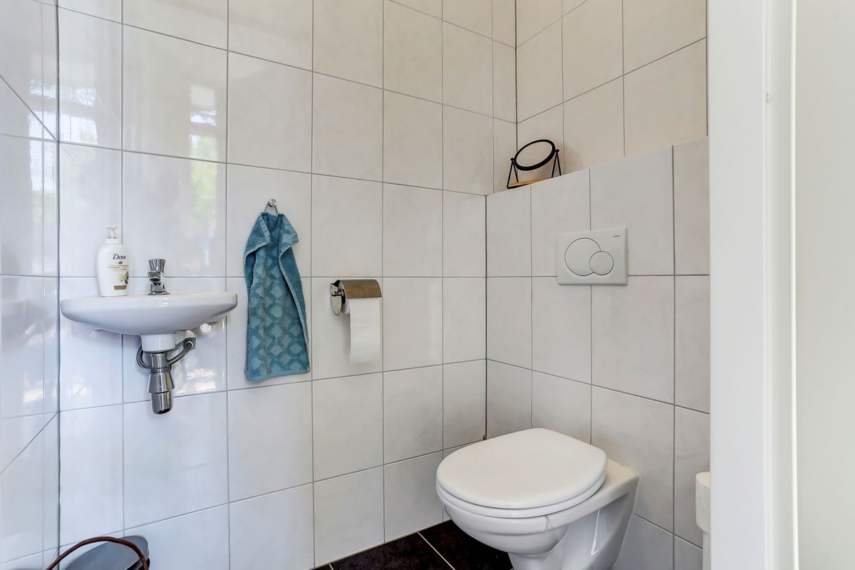 Ruime entree met garderobenis, meterkast en een toiletruimte voorzien van een closet en fonteintje.