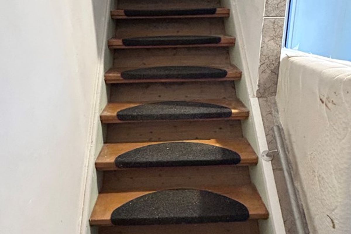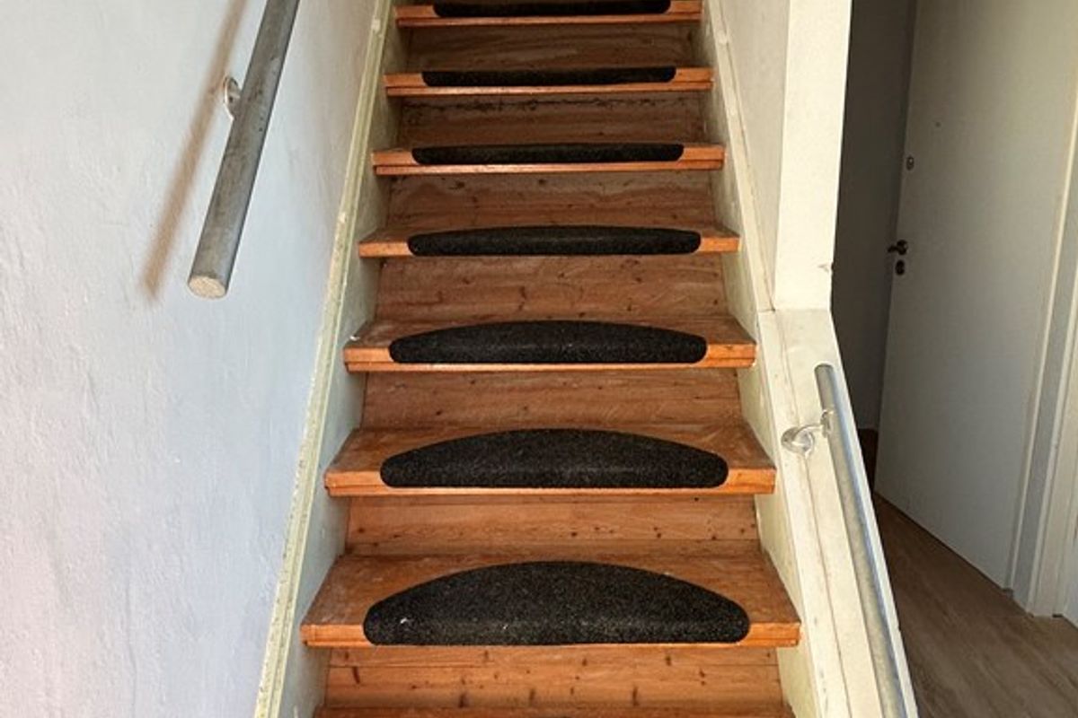 Entree/hal 3,85 x 2,20 met plavuizenvloer, berging onder trap naar verdieping, deur naar slaapkamer en stookruimte en trap naar eerste verdieping.