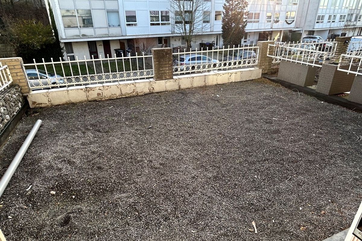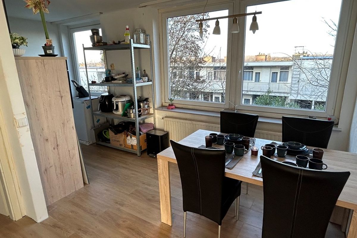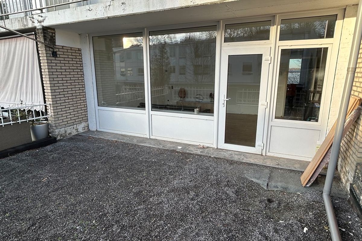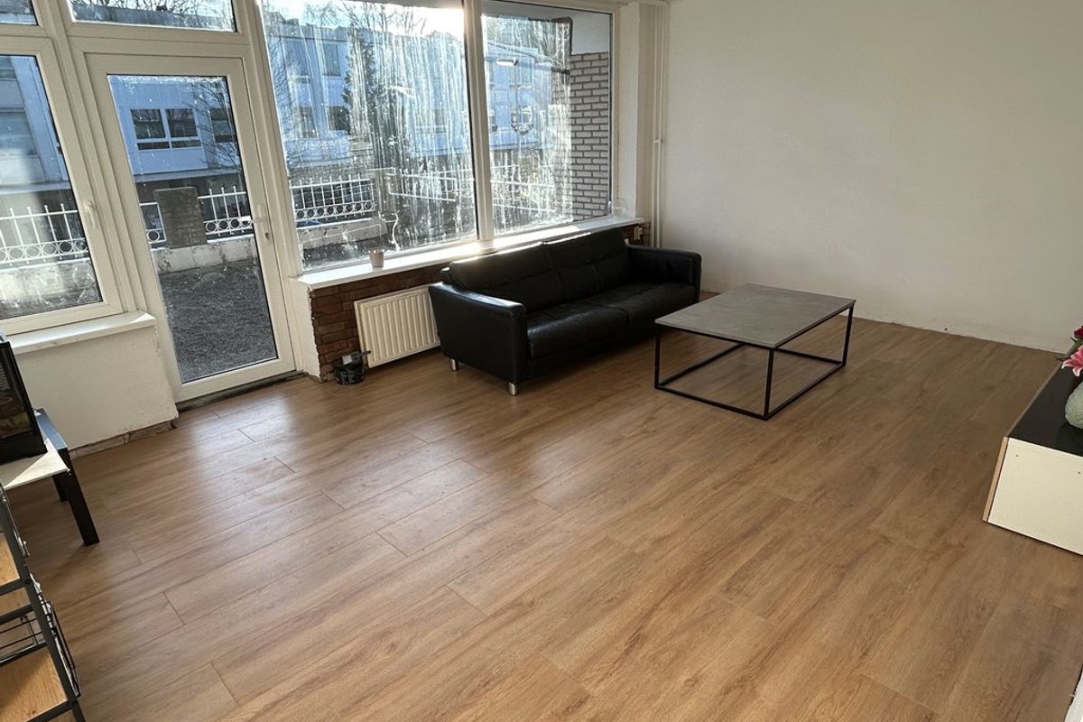 Woonkamer 5,70 x 3,95 met laminaatvloer en deur naar betegeld dakterras 5,70 x 4,70 met hekwerk.