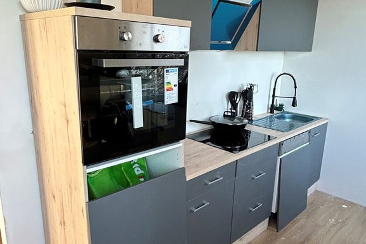 Keuken 5,70 x 3,40/2,20 met laminaatvloer en aanbouwkeuken met elektrische kookplaat met RVS afzuigunit, bakoven, vaatwasser, koel/vriescombinatie en spoelbak.