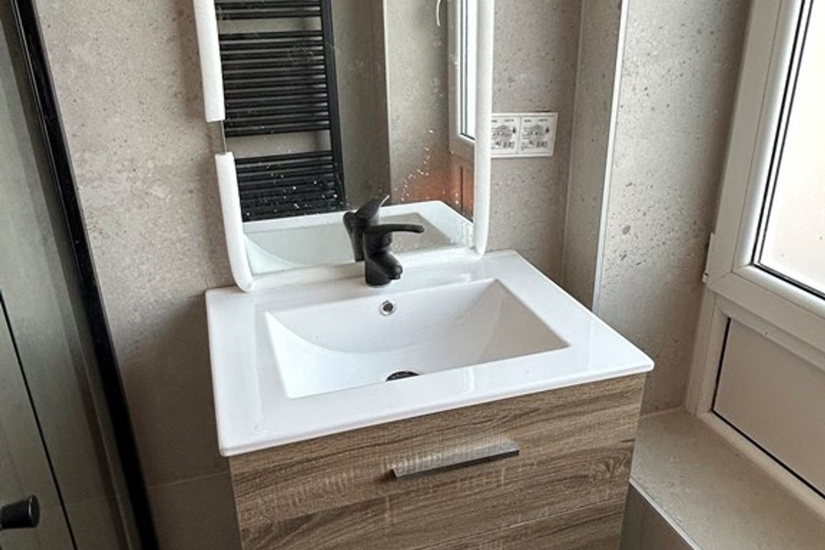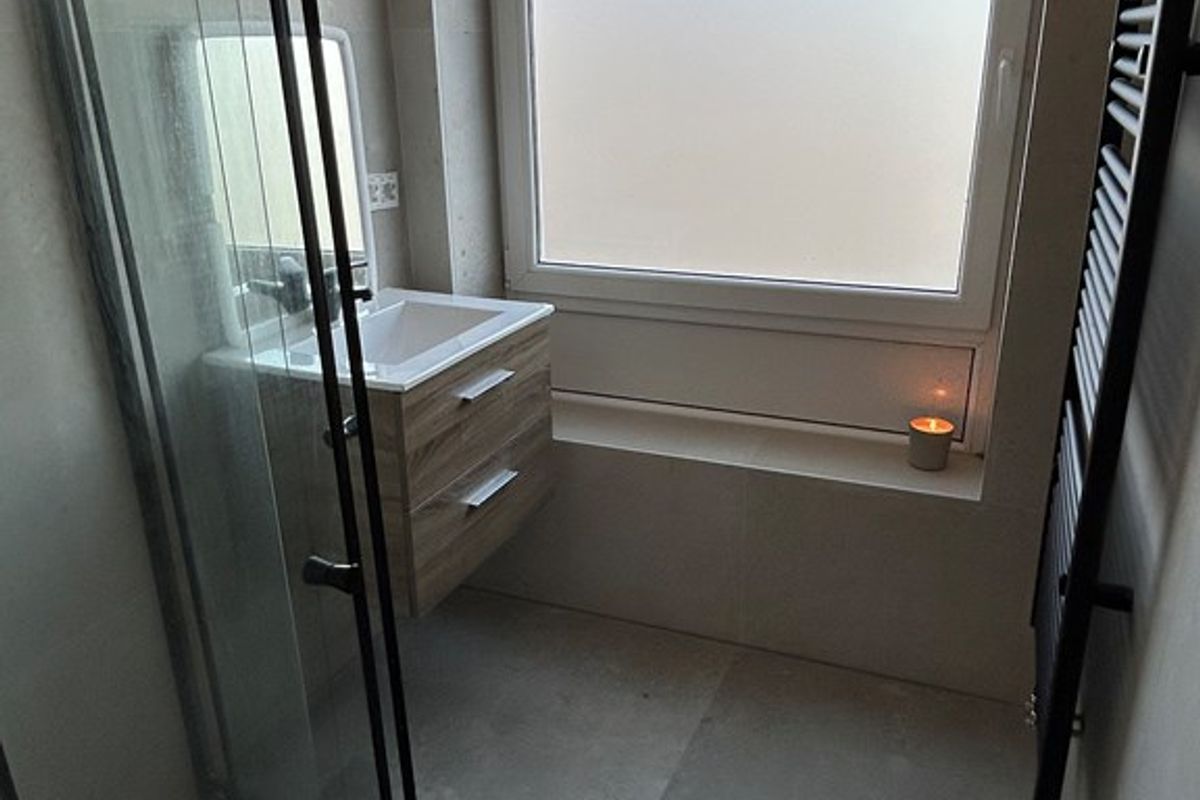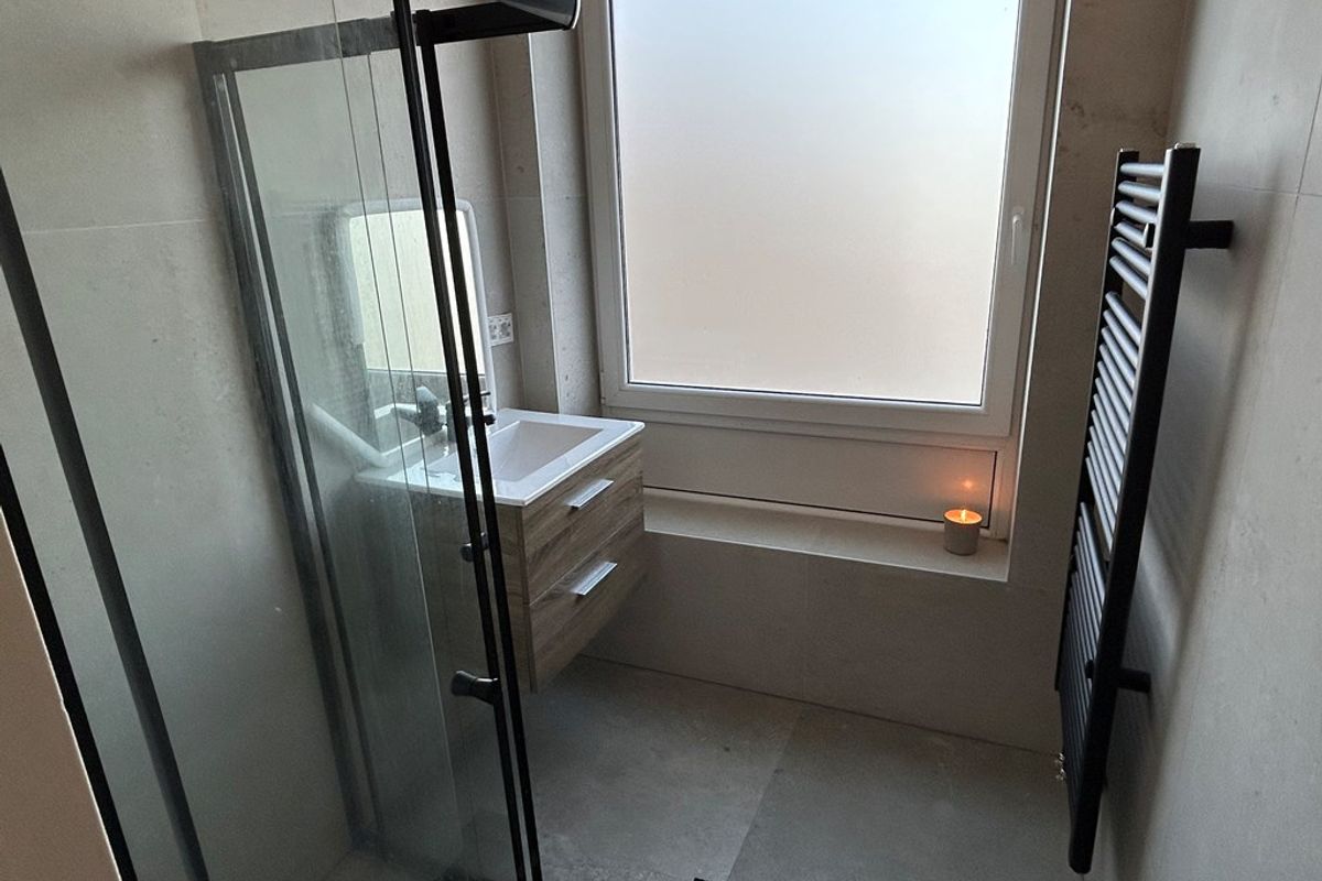 Badkamer 1,85 x 1,70 met plavuizenvloer, douche met cabine en badkamermeubel met wastafel.