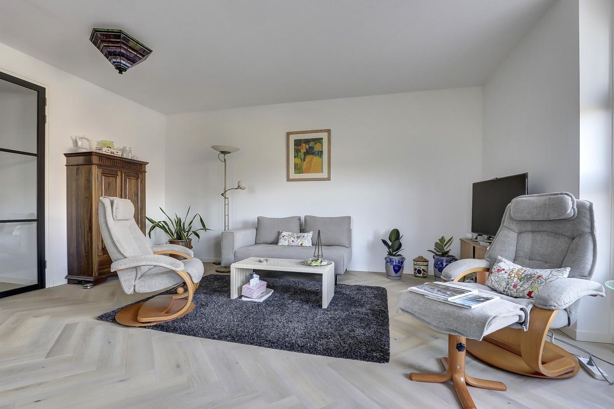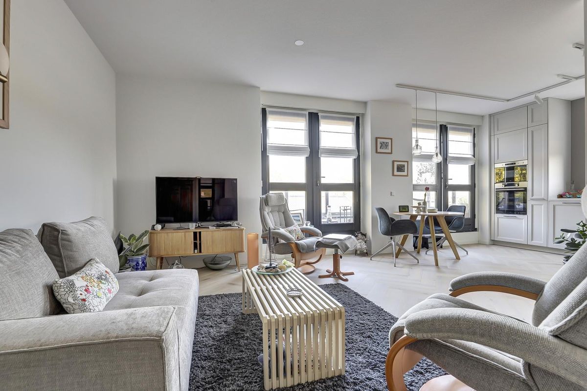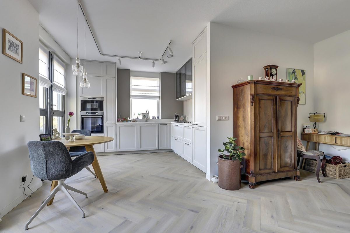 De woonkamer is heerlijk licht dankzij de grote raampartijen en de naar binnen openslaande deuren naar het balkon. De neutrale kleuren en de visgraat-pvc-vloer zorgen voor een moderne en stijlvolle uitstraling. De ruimte biedt voldoende plek voor zowel een gezellige zithoek als een eethoek.