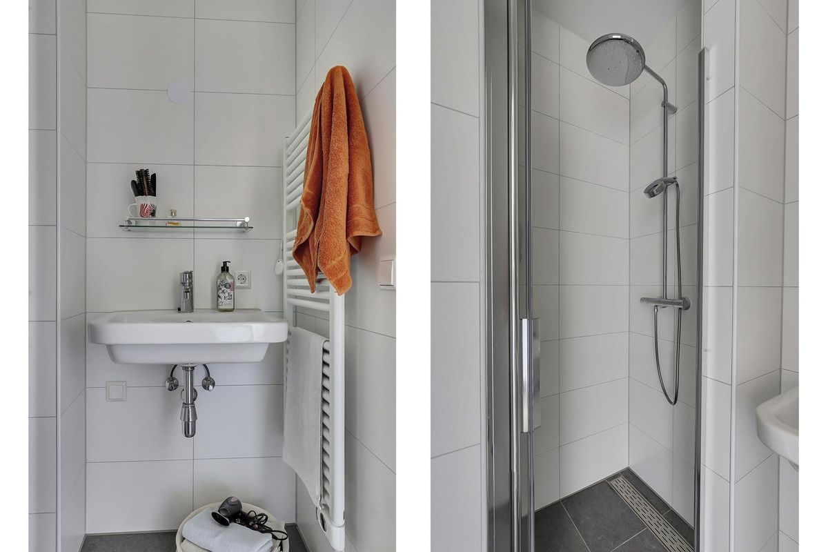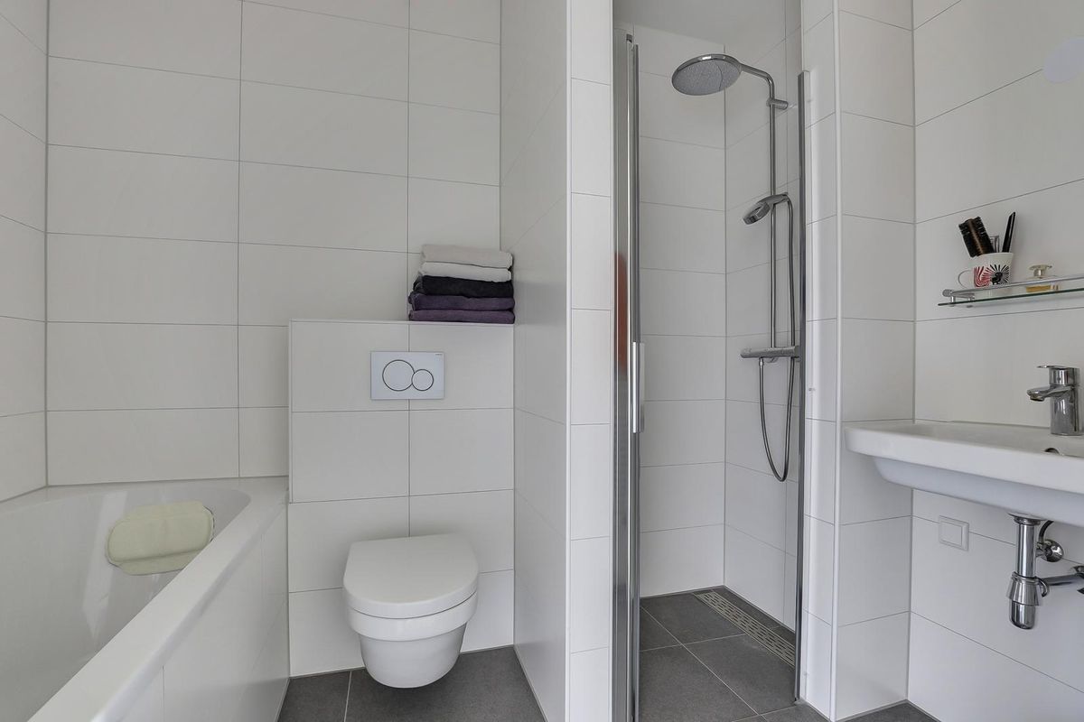 De slaapkamer is ruim en licht, met voldoende plek voor een groot bed en een kledingkast. De moderne badkamer is volledig betegeld en voorzien van een ligbad, inloopdouche, wastafel en tweede toilet. Daarnaast beschikt het appartement over een inpandige ruimte met aansluiting voor wasmachine en droger, praktisch en netjes weggewerkt.