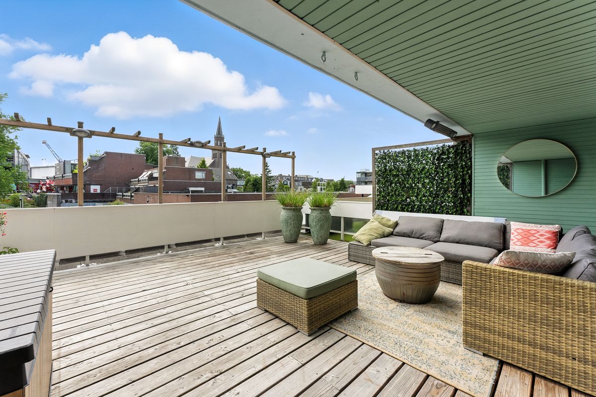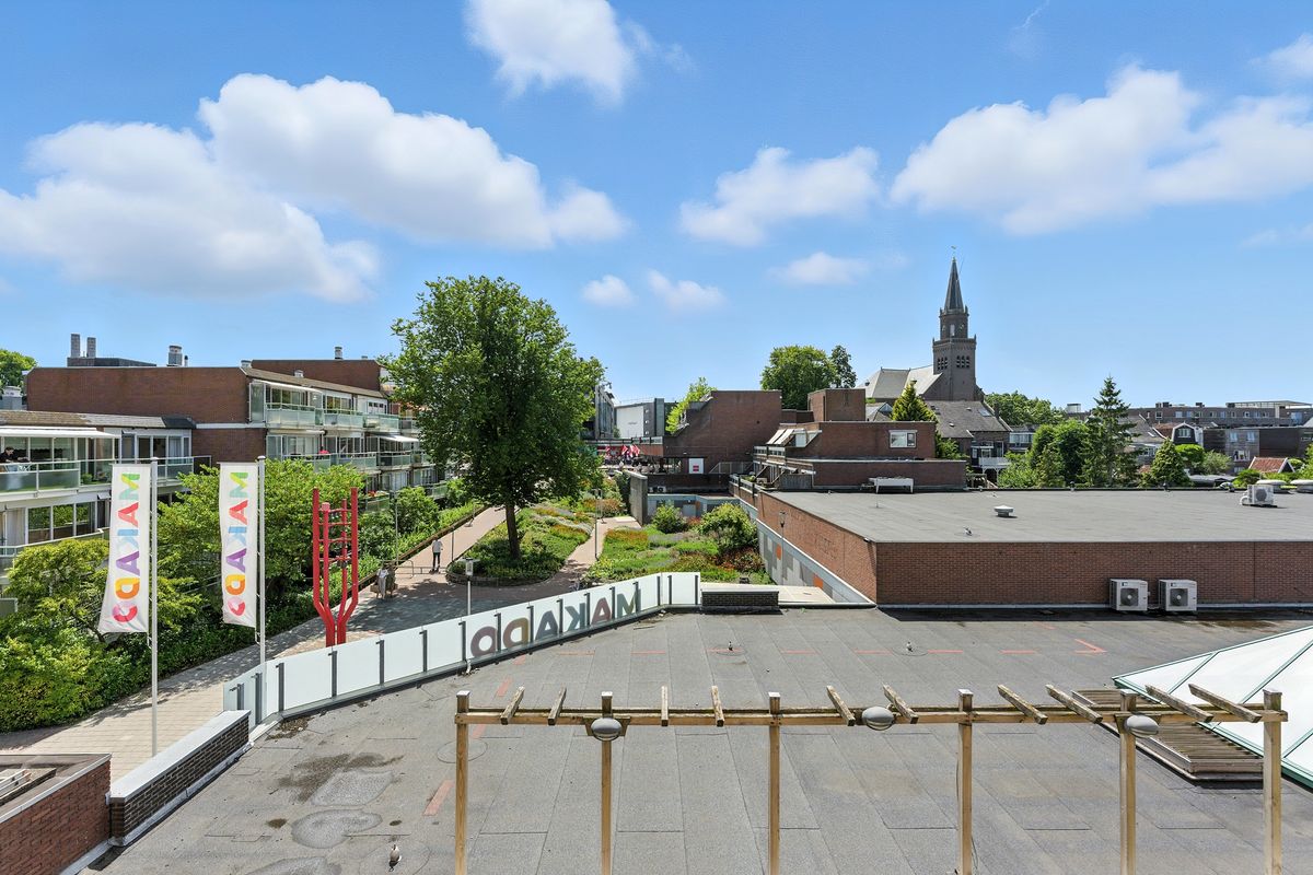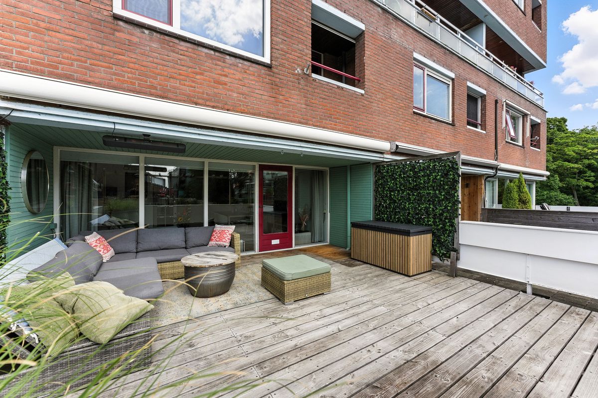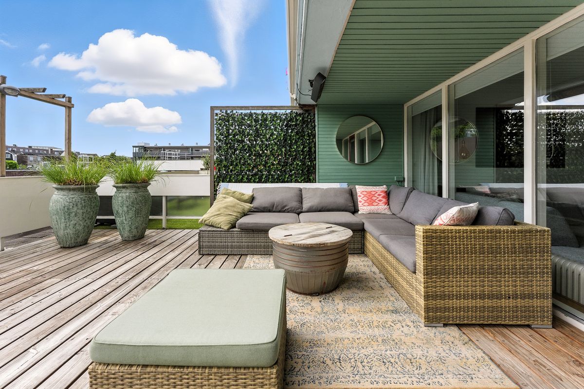 Terras: Het ruime terras (afm. ca. 5.62 x 5.59) op het zuidwesten is een fijne plek om te genieten van de zon. Het is voorzien van elektra, een heater en een zonnescherm, waardoor je er ook op koelere avonden comfortabel kunt zitten. De nette vlondervloer geeft een keurige uitstraling en de aanwezige loungeset blijft achter. Vanaf het terras heb je een levendig uitzicht op het winkelend publiek.