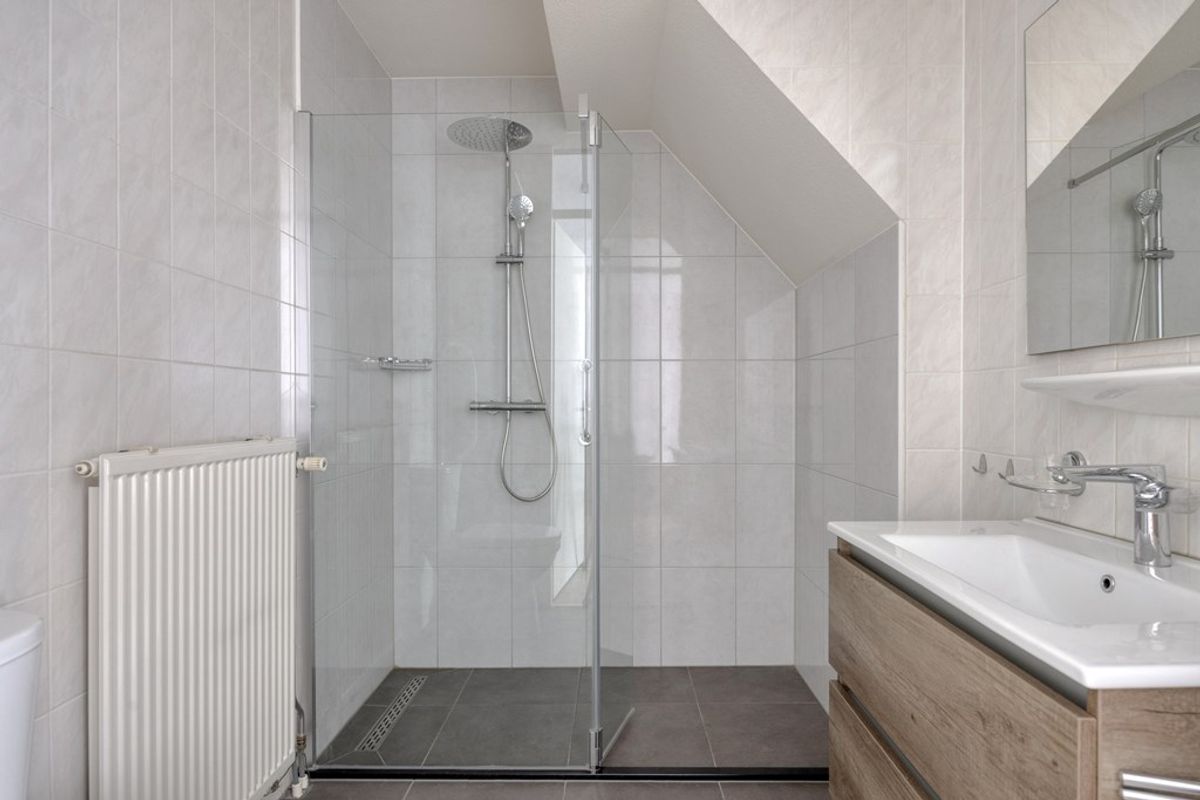 De overloop geeft toegang tot twee ruime slaapkamers en een tweede badkamer. Eén slaapkamer beschikt over een grote inloopkast, ideaal voor extra bergruimte. De badkamer is voorzien van een douchecabine, wastafel en toilet.