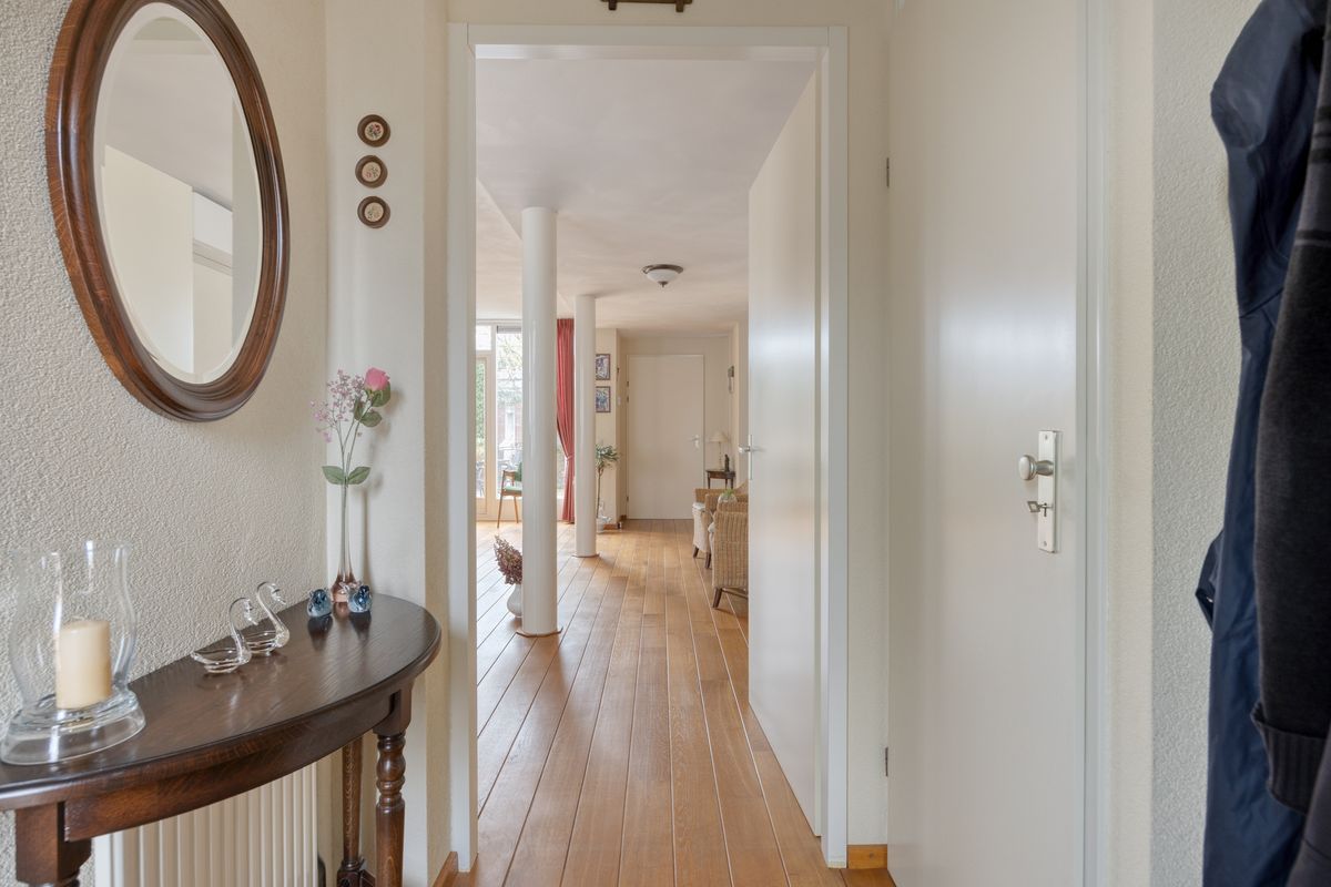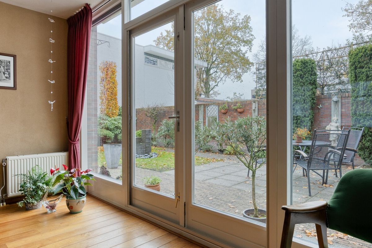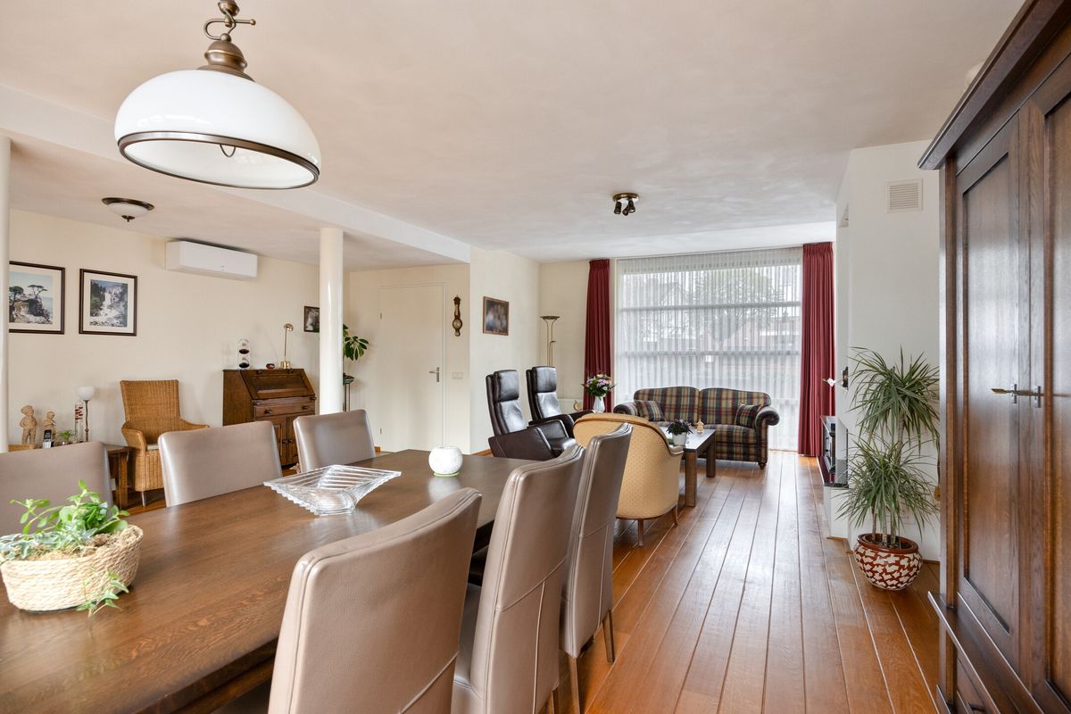 Via de overdekte entree bereikt u de hal met meterkast, die toegang geeft tot de L-vormige woonkamer. Deze royale leefruimte is voorzien van een gashaard en airconditioning, en biedt volop ruimte voor zowel een zit- als eetgedeelte. De gestucte wanden en plafonds, gecombineerd met een prachtige massief eikenhouten vloer en grote raampartijen, zorgen voor een warme en lichte sfeer. Via de openslaande deuren bereikt u het terras en de fraai aangelegde achtertuin. De halfopen keuken is licht van kleur en beschikt over een hoekopstelling met veel opbergruimte en diverse inbouwapparatuur, waaronder een 4-pits gaskookplaat, afzuigkap, koelkast en vaatwasser. Aansluitend vindt u de praktische bijkeuken met de cv-combiketel en de aansluitingen voor wasapparatuur. Vanuit de bijkeuken is er directe toegang tot de inpandige garage. Een tussenportaal vanuit de woonkamer leidt naar het toilet, de begane grond slaapkamer en de trap naar de eerste verdieping. De slaapkamer is netjes afgewerkt gestucte wanden en zonwerende screens, en heeft via een loopdeur direct toegang tot de achtertuin. De moderne badkamer (2023) beschikt over een toilet, douchecabine en wastafel en is en suite verbonden met de slaapkamer.