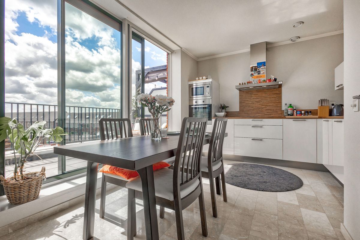 De goed onderhouden moderne keuken is voorzien van diverse inbouwapparatuur, o.a. een koelkast, vriezer, vaatwasser en combi-oven/magnetron. Tevens bevindt zich hier een kast met o.a. de wasmachine en extra bergruimte. Via de schuifpui in de keuken is toegang tot het zonnige en ruime balkon waar je vrij zicht hebt. Ideaal en privé buiten genieten het hele jaar!
