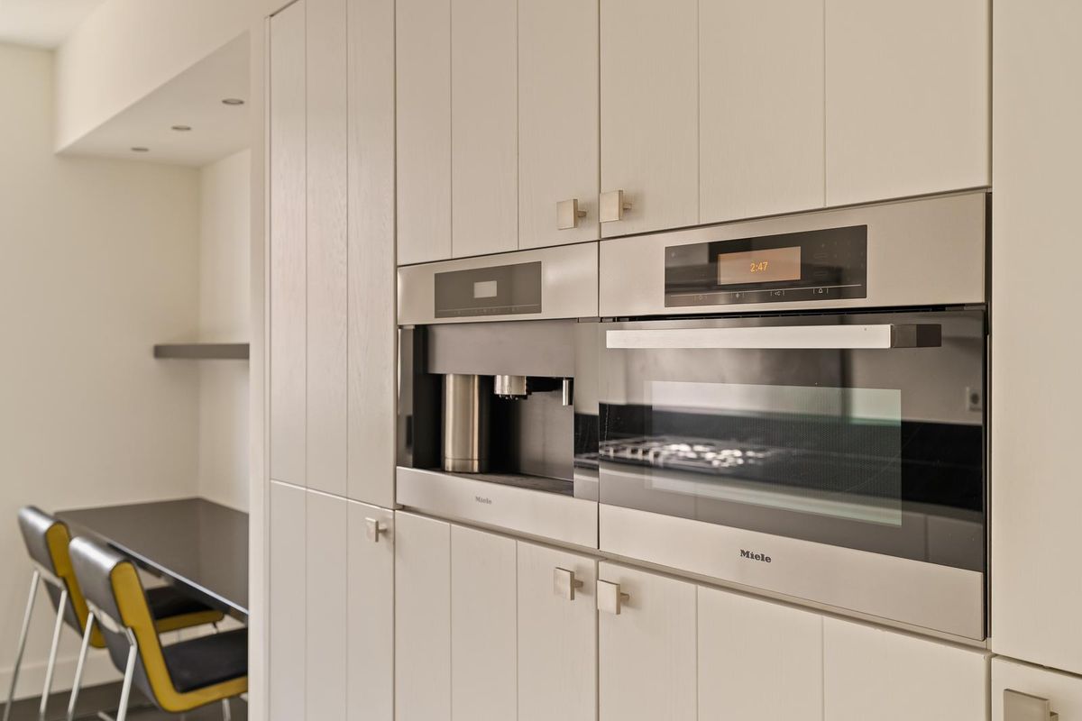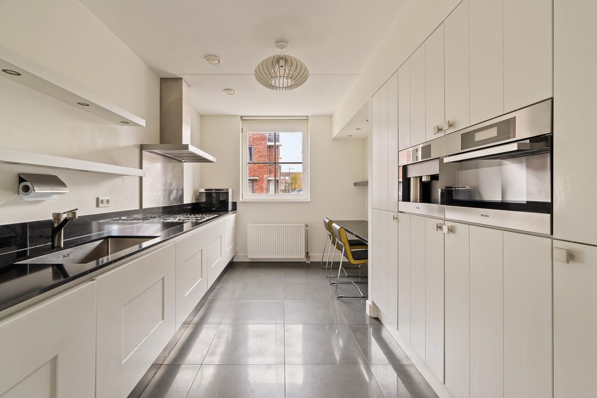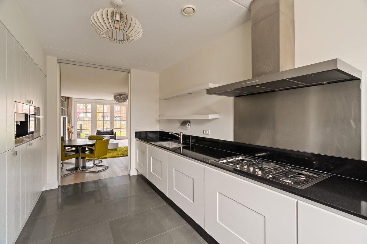 De moderne keuken is aan de voorzijde van de woning gesitueerd. De keuken is aan twee zijden opgesteld en via schuifdeuren afsluitbaar van de woonkamer. Deze is voorzien van diverse inbouwapparatuur, waaronder een 5-pits gaskookplaat, combi-oven en vaatwasser.