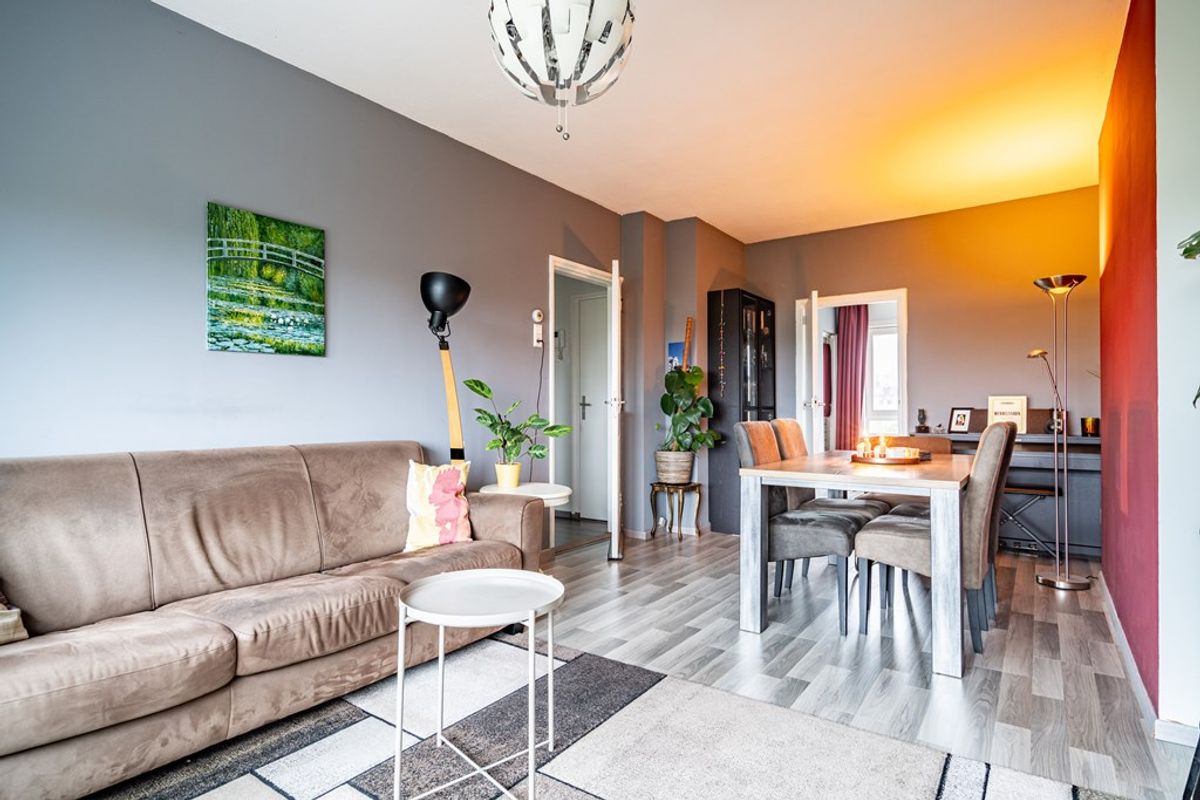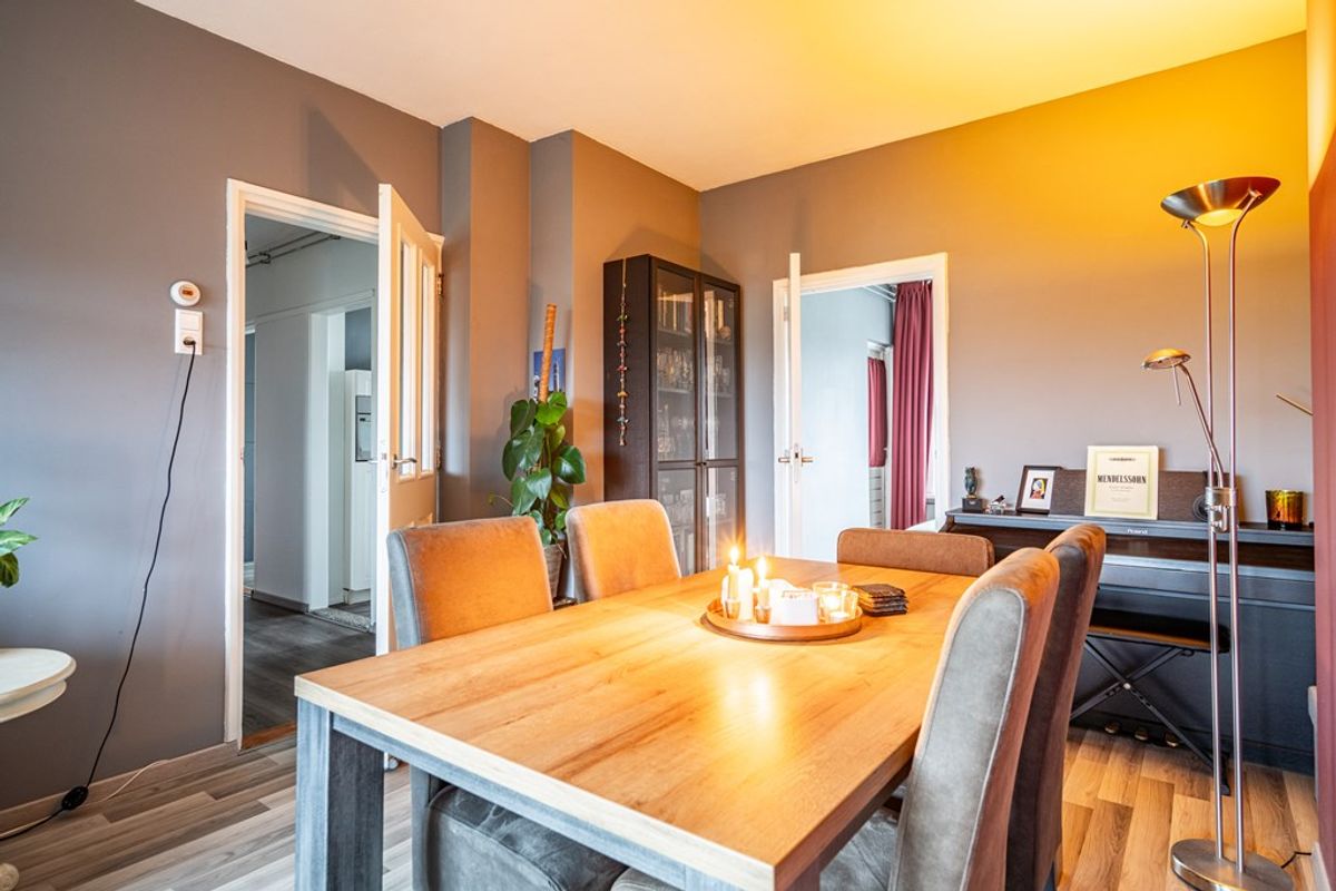 De lichte woon-/eetkamer aan de voorzijde biedt een vrij en groen uitzicht. Dankzij de goede afmetingen is er volop ruimte voor zowel een comfortabele zithoek als een gezellige eethoek.