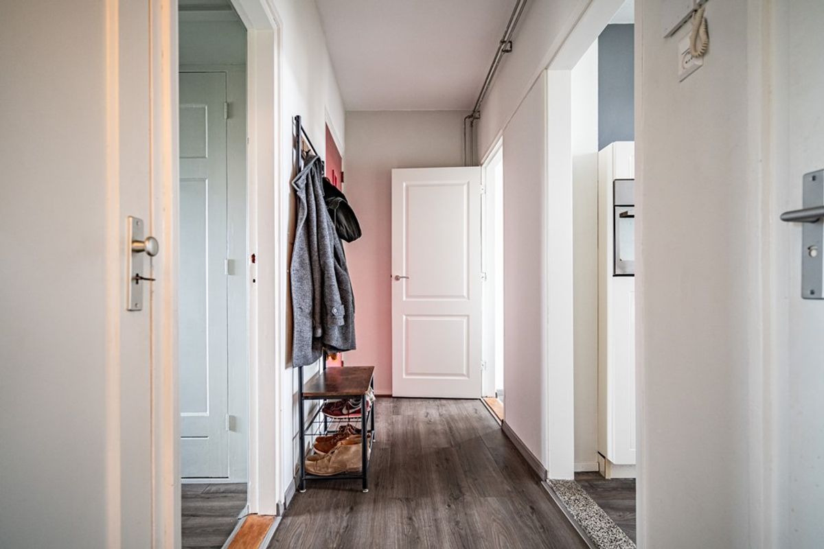 Afgesloten portiek met brievenbussen en intercom. Via het trappenhuis bereikt u de entree van het appartement op de tweede verdieping.