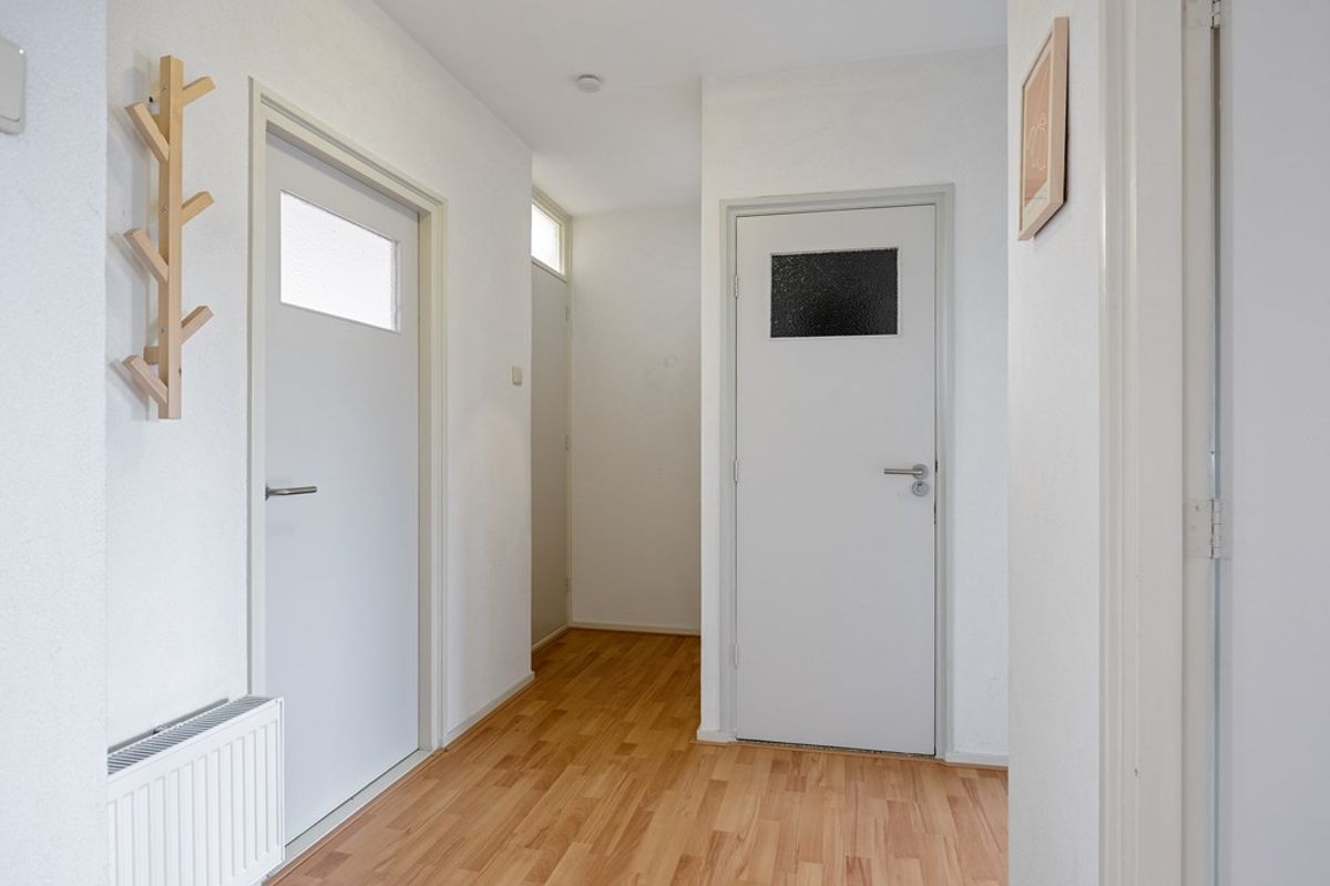 Entree met intercominstallatie en toegang tot een inpandige fietsenberging van circa 8 m². Via het trappenhuis bereik je de woonverdieping gelegen op de tweede etage.