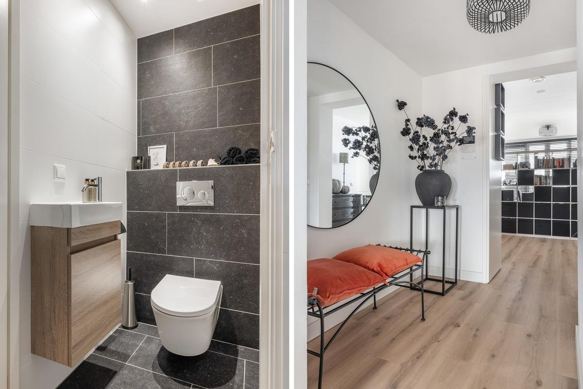 Ruime hal met meterkast en videofoon. Vanuit hier zijn de twee slaapkamers, toilet, badkamer, wasruimte en de woonkamer bereikbaar. Aan de achterzijde van de hal is ruimte voor een werk- of zithoek, met openslaande deuren naar het balkon.