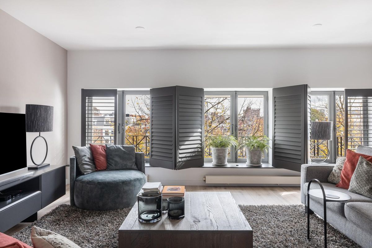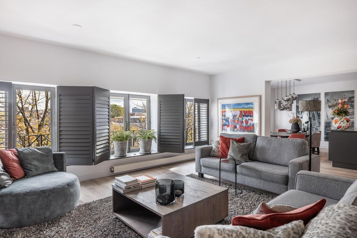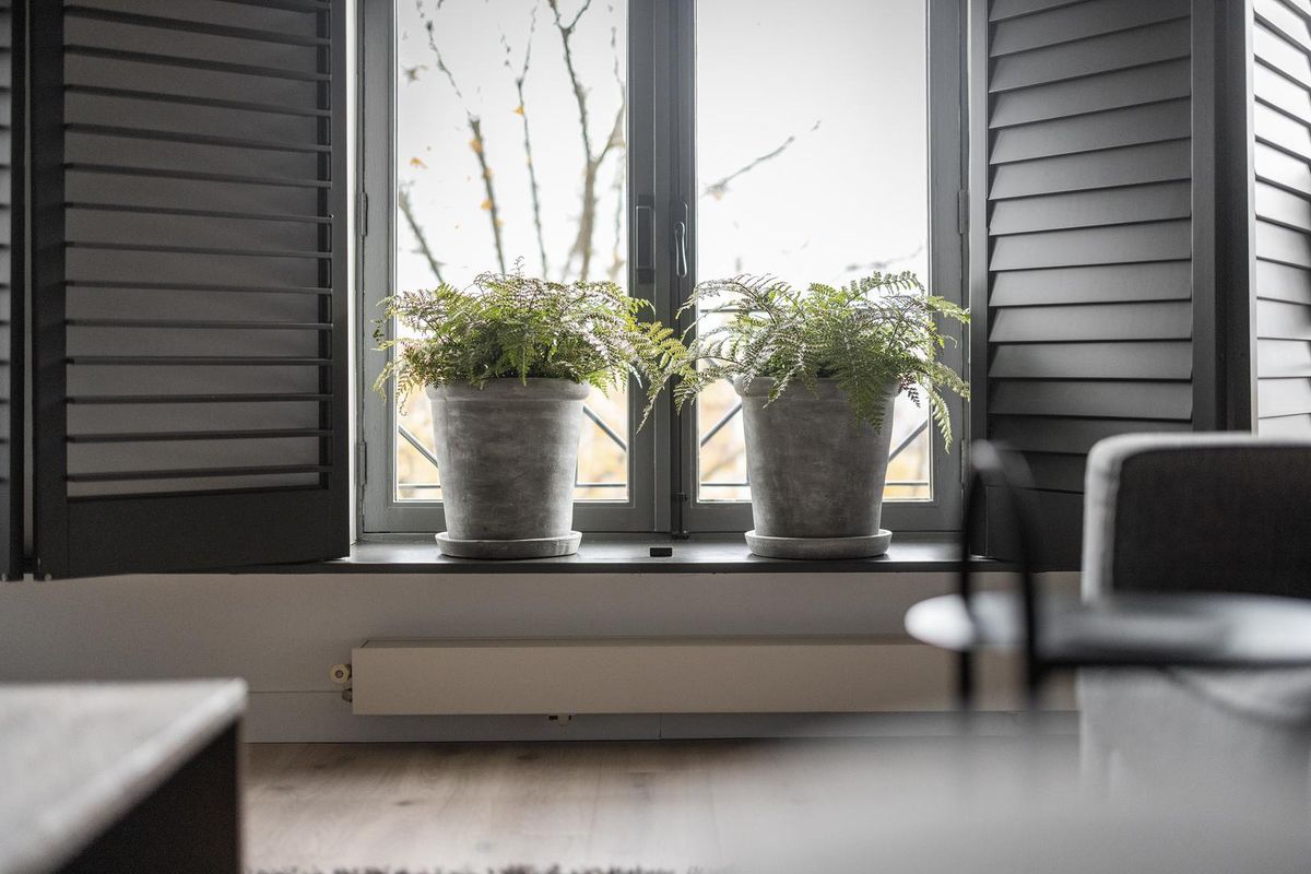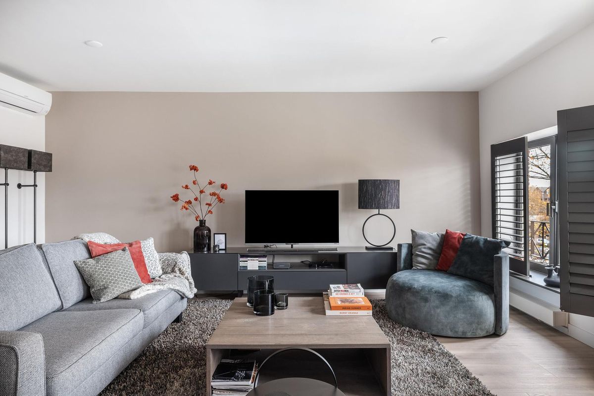 Royale woonkamer met grote raampartijen en een fantastisch uitzicht over de Nieuwe Haven. De ruimte is voorzien van een stijlvolle PVC-vloer, airconditioning en veel natuurlijk licht.