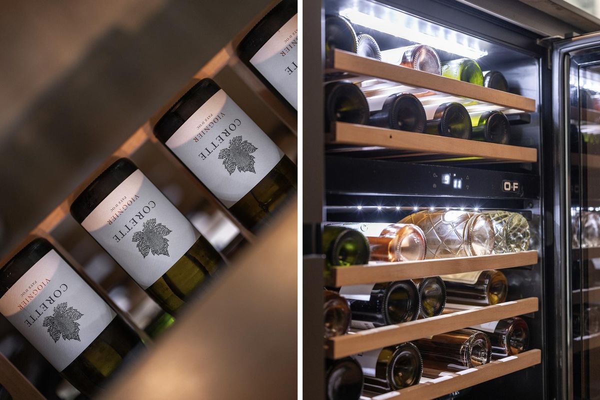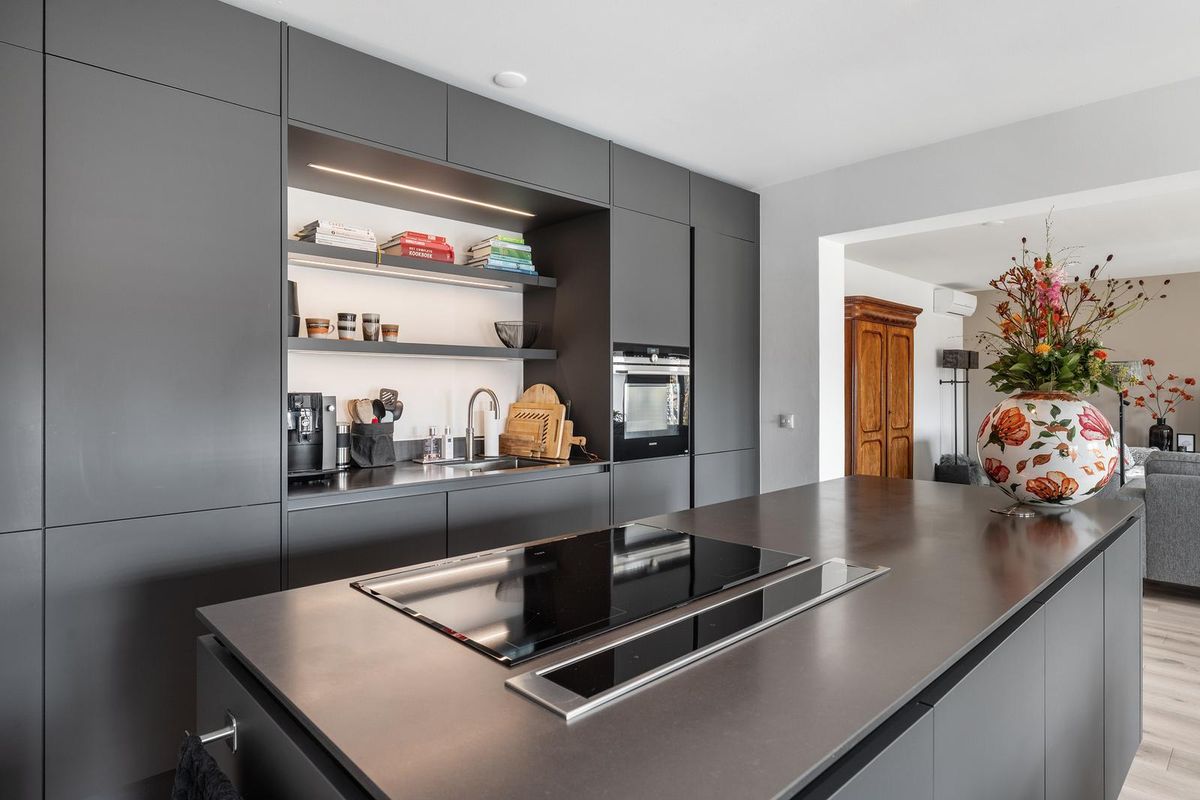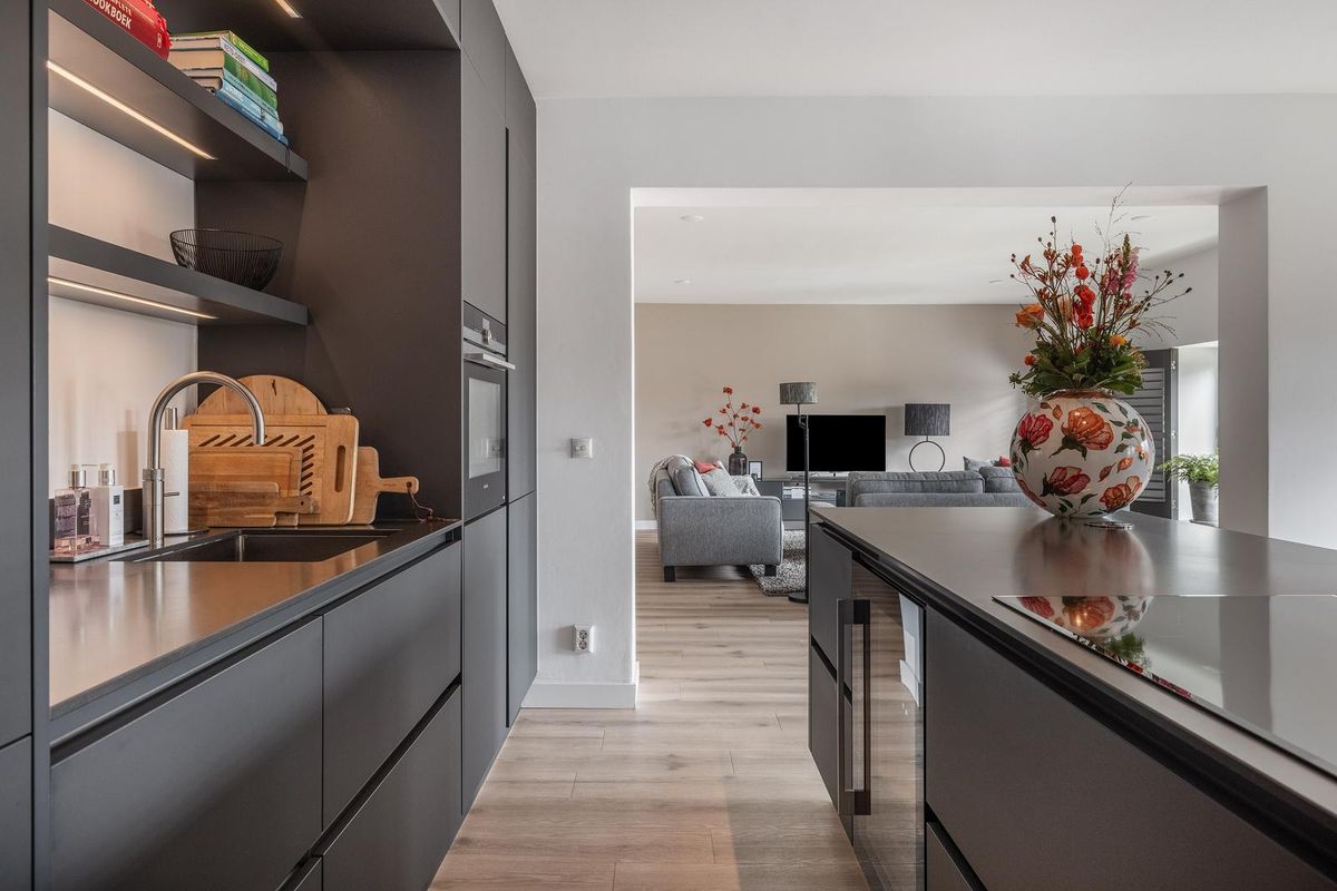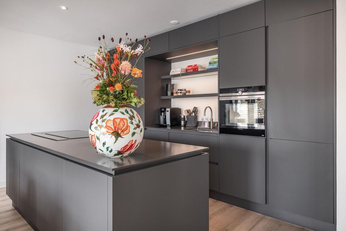 De luxe keuken met kookeiland is uitgerust met een inductiekookplaat met geïntegreerde afzuiging, Quooker, spoelbak, vaatwasser en wijnklimaatkast. Aan weerszijden van het eiland bevindt zich veel opbergruimte. In de wandopstelling vind je een combimagnetron, oven, koelkast en vriezer.