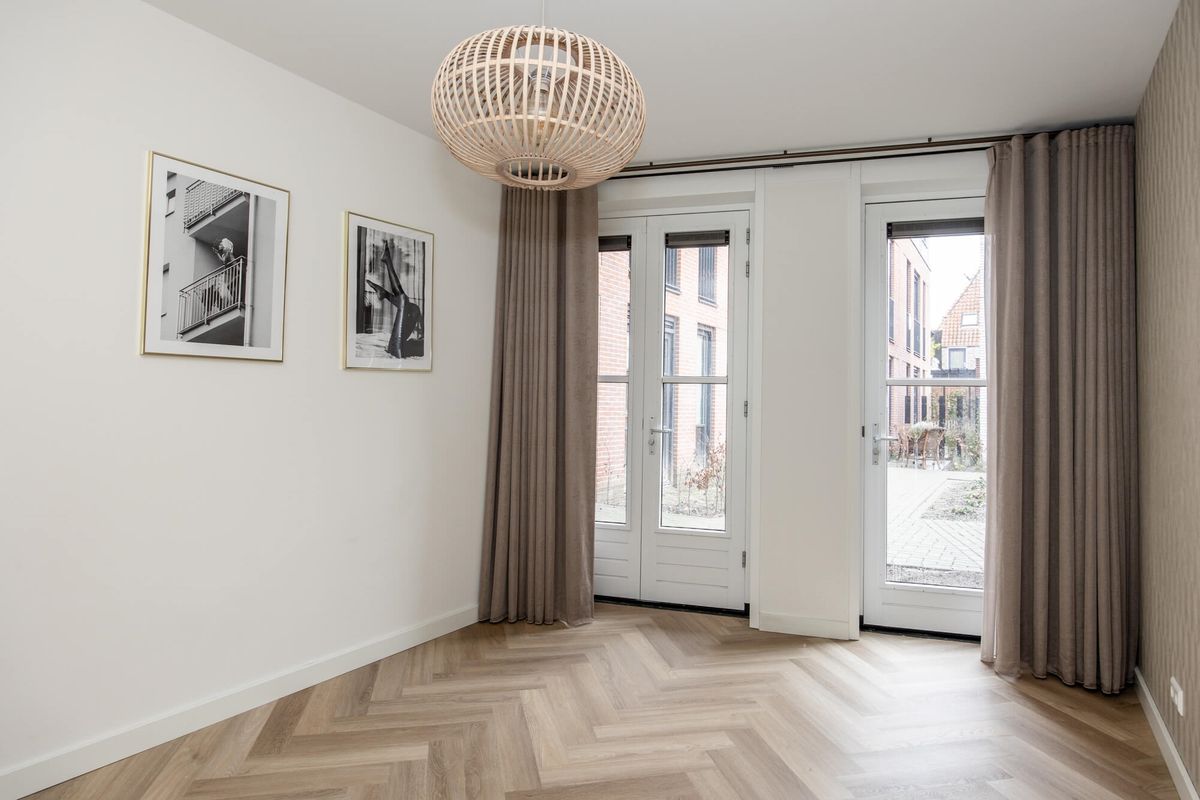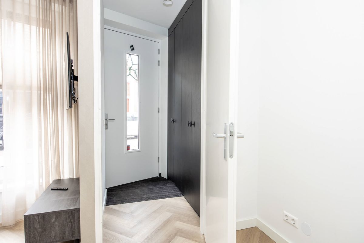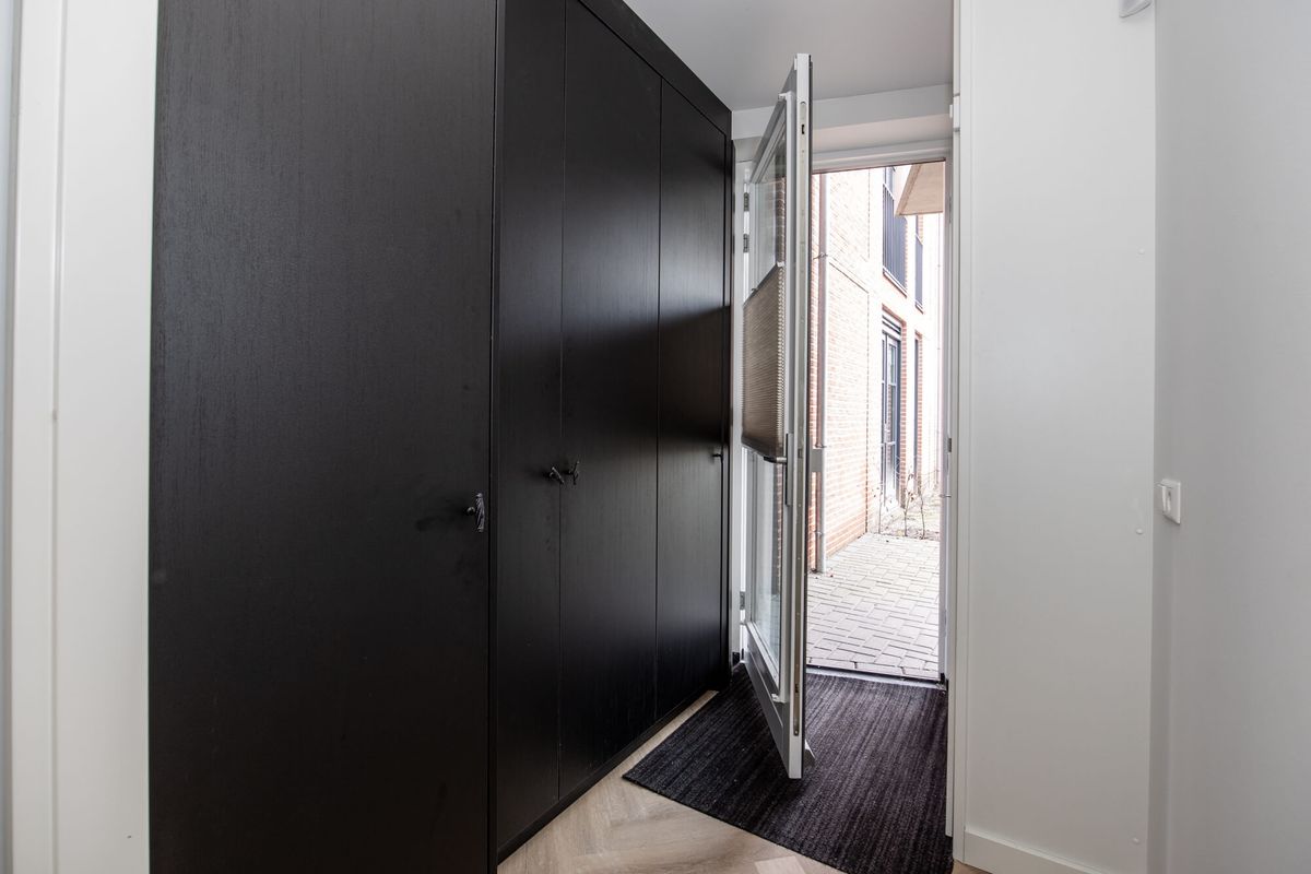 In de gang heb je het toilet, een opbergkast en de toegang tot de slaapkamer. De slaapkamer is ruim, heeft prachtige gordijnen, is nu al sfeervol en je kan hier heerlijk tot rust komen. In de slaapkamer is een deur naar de binnentuin van het apprtementencomplex. Terug in de gang, hier heb je een toegang naar de achterdeur met in deze hal ook weer op maat gemaakte opbergkasten. De achterdeur komt uit op de binnentuin van het complex. Hier heeft u een eigen stukje tuin.