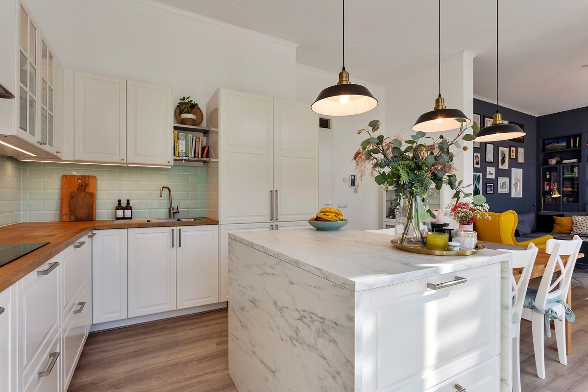 Upon entering, you're welcomed into a spacious hallway with ample built-in storage – perfect as a utility or storage space. There is also a separate toilet here. From the hallway, you enter the modern kitchen, a real eye-catcher, featuring a kitchen island, induction cooktop, extractor hood, oven, microwave, fridge, freezer, and dishwasher. French doors open up to a sunny outdoor spot – ideal for enjoying a coffee in the morning sun.