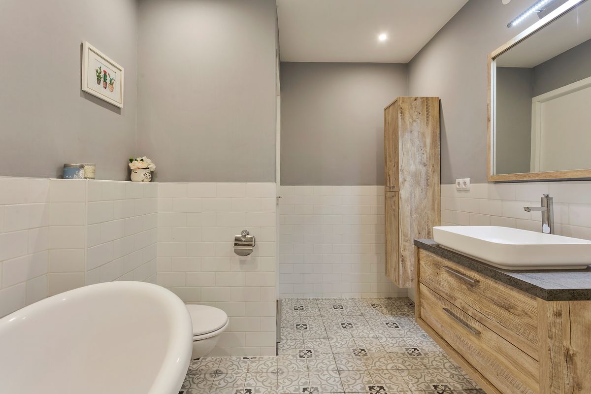 De trap in de hal brengt je naar de eerste verdieping. Op de overloop vind je een handige kast met wasmachine. De badkamer is stijlvol ingericht met een vrijstaand bad op pootjes, douchecabine, hangend toilet en een fraai wastafelmeubel. De twee ruime slaapkamers op deze verdieping bieden allebei toegang tot een heerlijke loggia, een fijne plek om je dag ontspannen af te sluiten met een drankje.