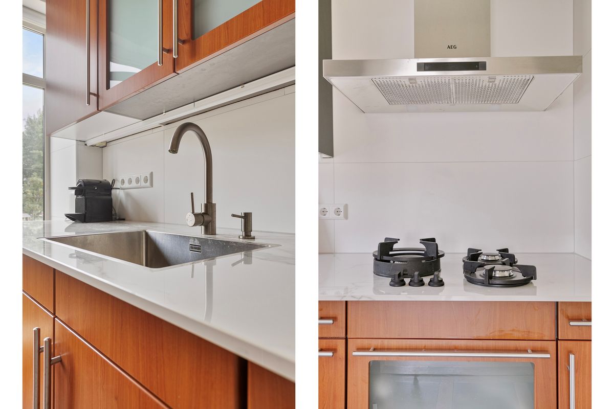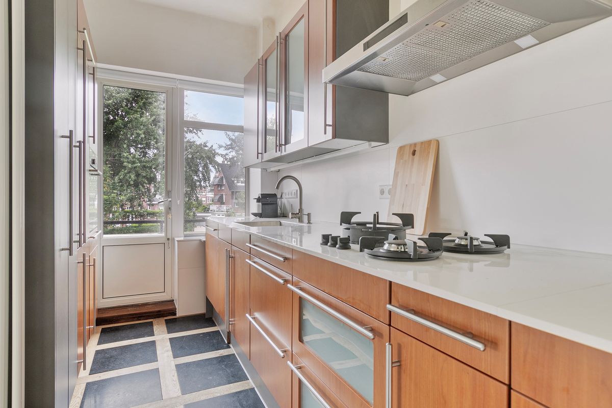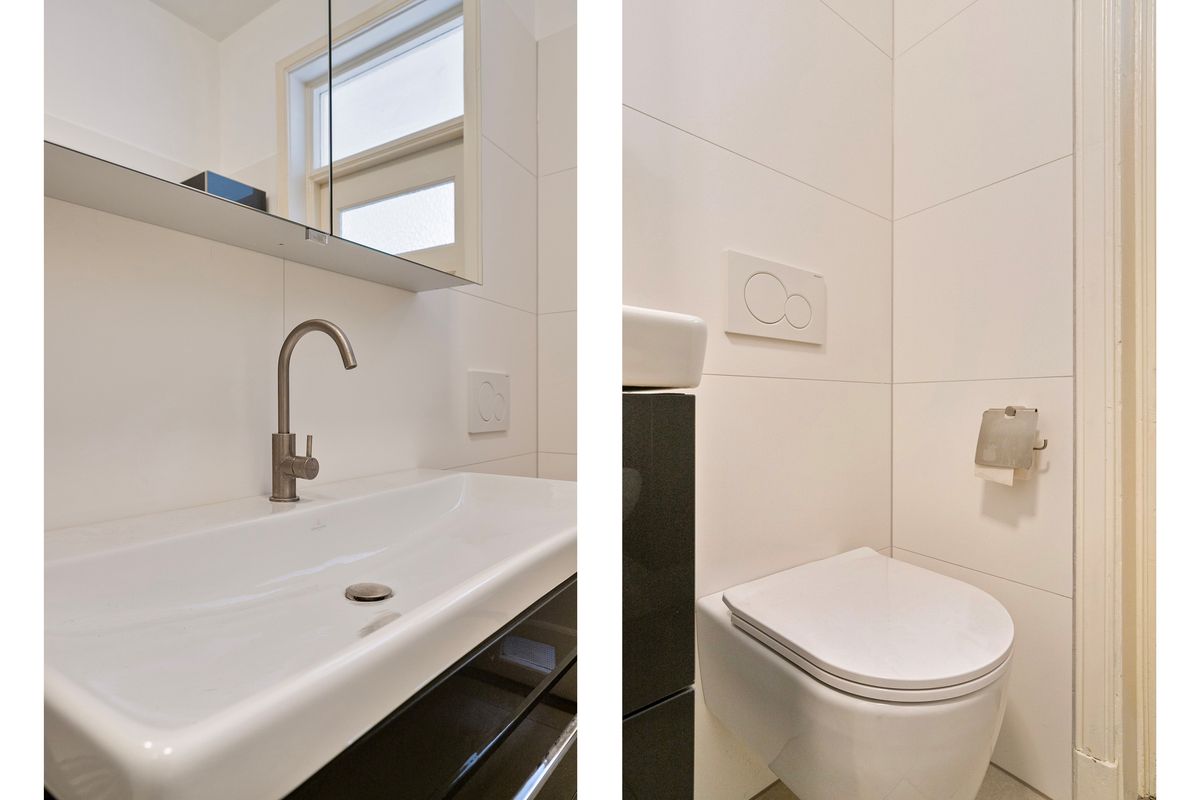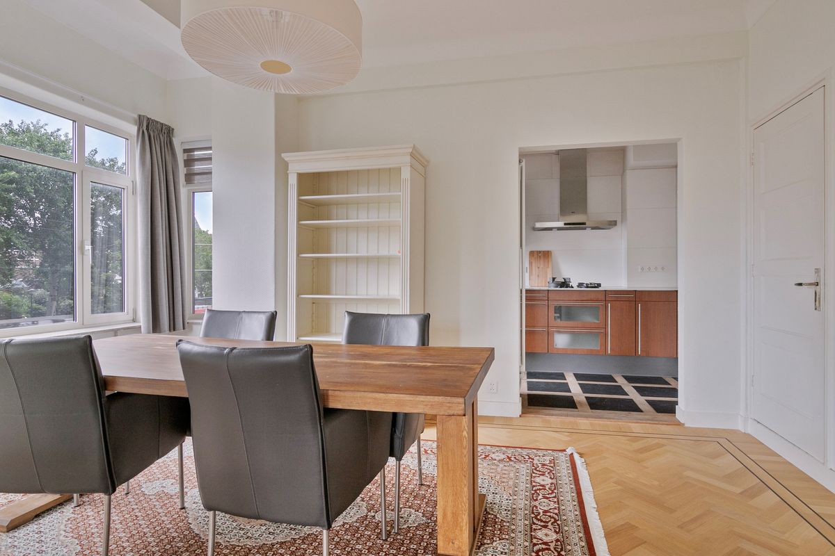 Communal entrance at the ground floor with marble flooring and walls, intercom system, and mailboxes. Stairs or elevator to the first floor, entrance to the apartment. Hallway with space for coats and separate toilet with hand washbasin. Entrance to the bright living- and dining room with ensuite doors, a nice gas fireplace, and beautiful oak herringbone flooring throughout. From the living area, you have a lovely wide view of Scheveningen.