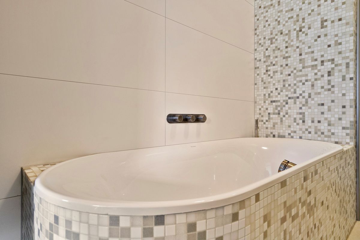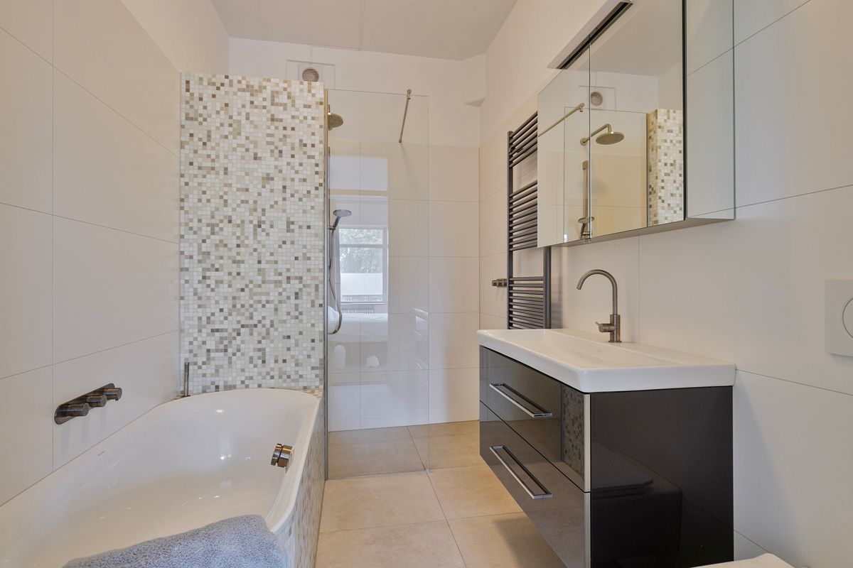 Luxurious half-open kitchen with marble look countertop, PITT cooking plate, dishwasher, refrigerator, freezer, and combination microwave/oven. From the kitchen, you can access the nice balcony with the morning sun. Good sized master bedroom of approx. 4.60 x 4.23 with a wardrobe and access to the second balcony. Adjacent modern bathroom equipped with underfloor heating, bathtub walk-in shower, and second toilet.