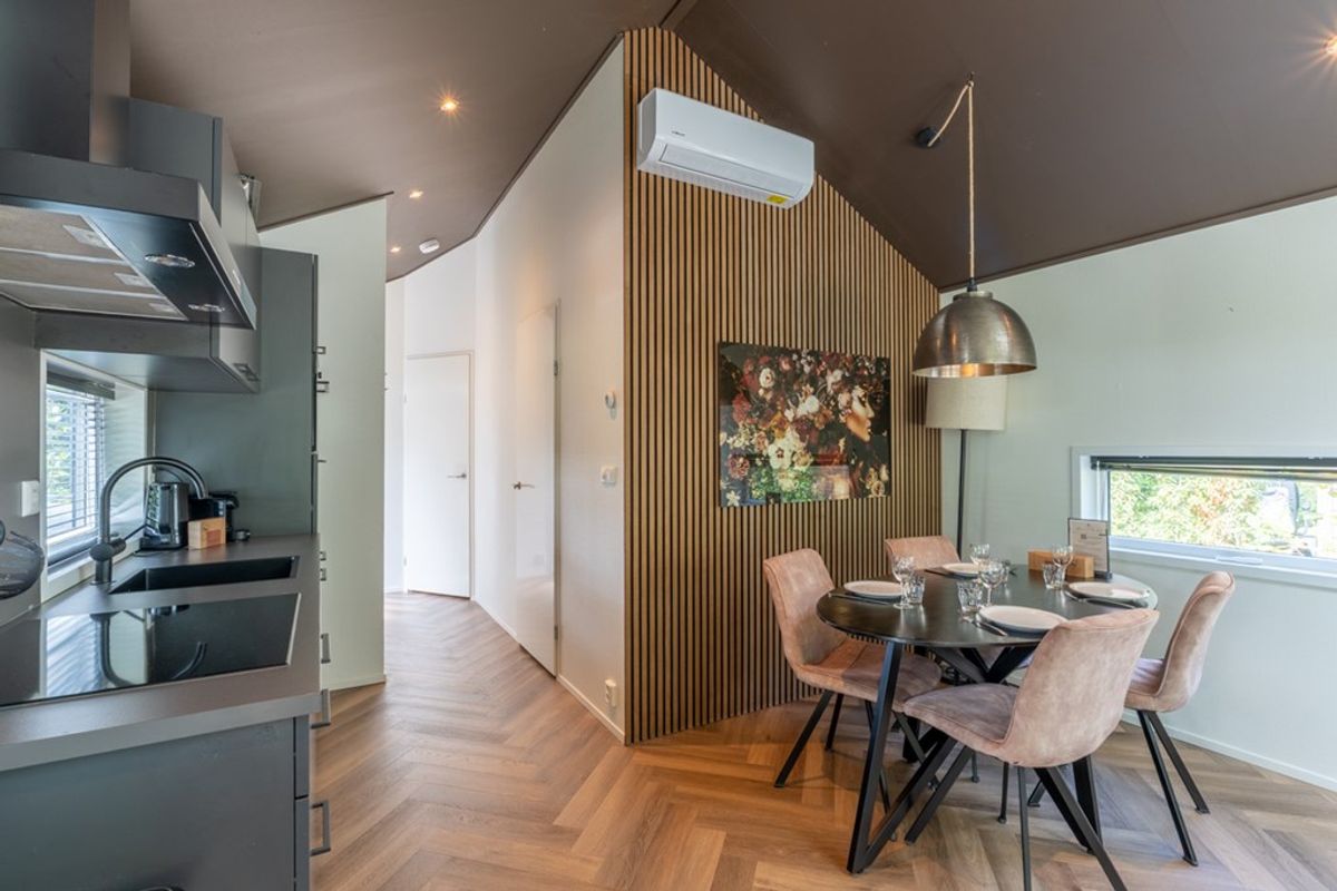 Binnen vind je een sfeervolle woonkamer met grote openslaande deuren naar de tuin, waardoor binnen en buiten naadloos in elkaar overlopen. De open keuken is volledig uitgerust met moderne apparatuur, zoals een combimagnetron, oven, Nespresso-apparaat, inductiekookplaat en een vaatwasser, ideaal voor gezellige avonden koken met uitzicht op het bos.