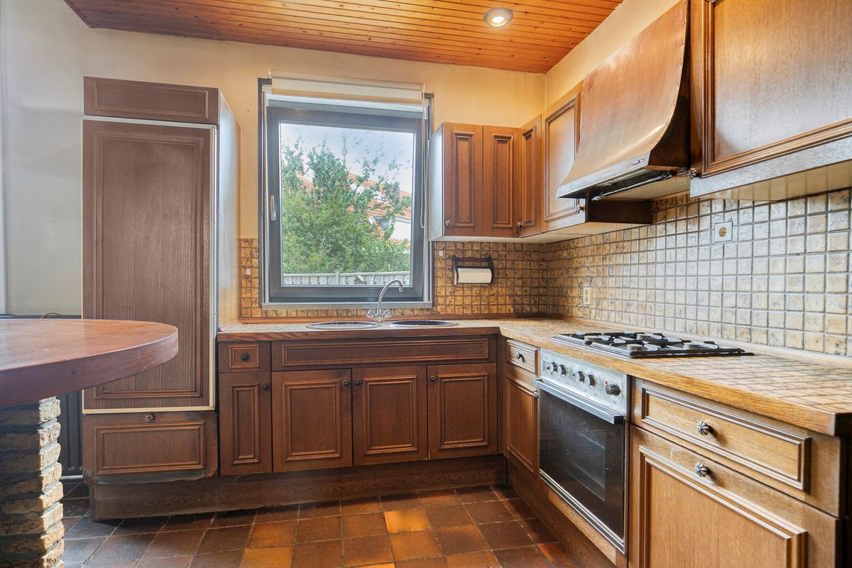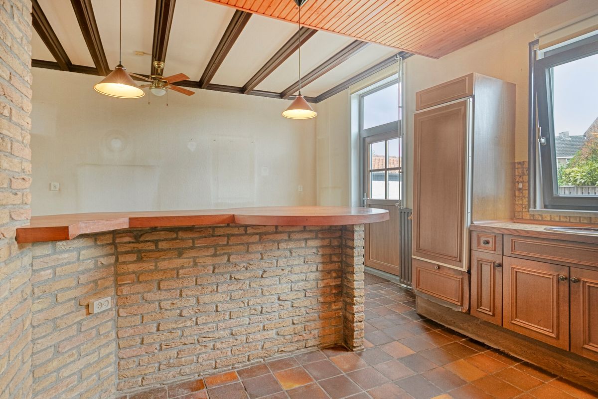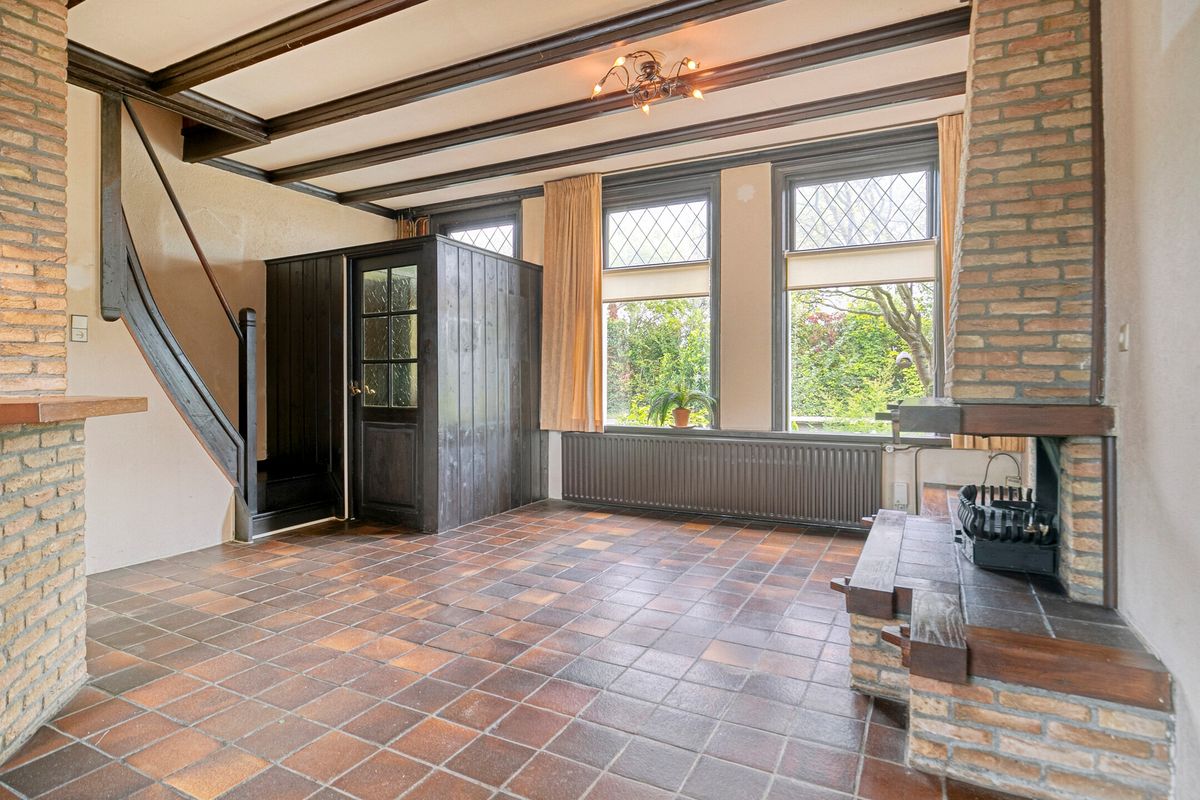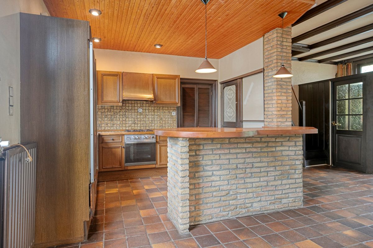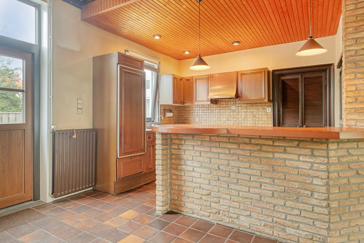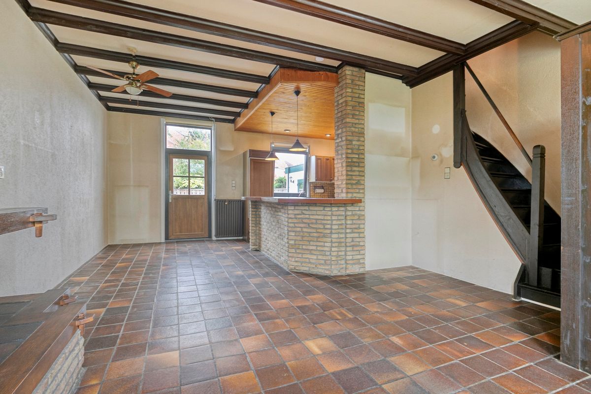 Entree, halletje met meterkast. Woonkamer met open haard en de open trap naar de verdieping. De keuken aan de achterzijde (tuingericht) is open, de inrichting van de keuken is gedateerd, maar de ruimte is zeker niet klein te noemen. Er is een vaste kast, praktisch voor de voorraad. Ook is er voldoende ruimte voor een eettafel, met vanuit de keuken een leuk zicht in de achtertuin.